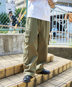 ベンデイビスからタフなコットンツイルを使用したカーゴパンツが登場!今までで一番太いシルエットになっており、裾を絞ることによってトレンドのサイズ感にもチェンジできます!両サイドに大小さまざまなポケットを施しており、ウエストゴムシャーリング+スピンドル入りでベルト無しでも履くことができる機能性抜群なアイテム!幅広いシーンで活躍するワードローブに加えたい存在感たっぷりな1着。単品でも様になるアイテムなのでこれからの季節にぴったりなので、おすすめな商品となります。