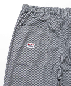 フロントに1タック、ウエスト部分にスピンドル、後ろウエストには平ゴムシャーリングを採用し、動きやすさを意識したイージーな穿き心地を実現!イージーシェフパンツ仕様でベルトレスで着用できるのがおすすめポイント!ワークらしい雰囲気に。