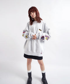ヘビー裏起毛のクルーネックスウェット。左胸にオーバルロゴ刺繍ワッペン、両袖に6種類のチームロゴ風の刺繍ワッペンを散りばめた豪華なデザイン!