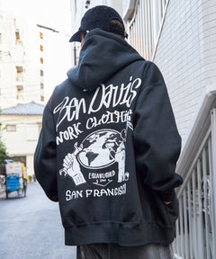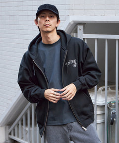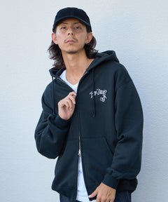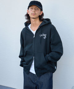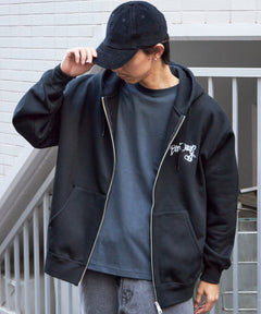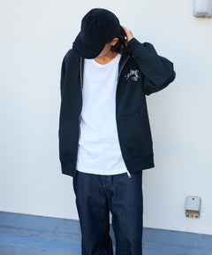 ウフォールダギングと8ボールをモチーフにしたモノトーンコーデ意識のクールなデザインフルジップパーカーです。 自慢の肉厚裏起毛でYKKメタル逆開ファスナーを使用。内部に小さな内ポケット。左胸は刺繍、背面は発泡とラバーPTの組み合わせ。しっかりとした生地なのでアウター感覚でも着用でき逆開きファスナーのため裾ジップを開けてインナー見せコーデも可能です”
