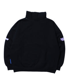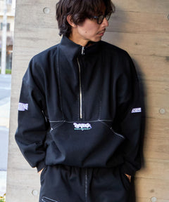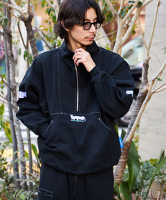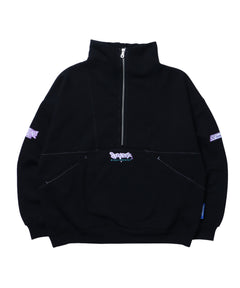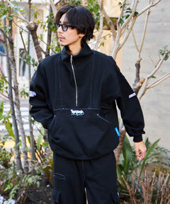 - 90s 1/2 ZIP SWEAT / 裏起毛 オーバーサイズ プルオーバー スウェット ルーズシルエット ハーフジップ 刺繍 ポケット ジップアップ セットアップ ブラック ≪SET UP着用可能≫