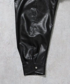 表地には、フェイクレザーを使用。フェイクレザーは天候を気にせず着ていただけます。 質感の柔らかい絶妙な光沢感でリュクスな雰囲気がある重量感のあるマットなフェイクレザー。裏地には耐摩耗性に優れているポリエステル素材100%を使用。縮み・型崩れが起きにくく、シワになりにくい心地よい仕上がりです。日々の生活をストレスフリーにしてくれます。通気性と吸湿性に優れており、快適に過ごせるサラッと柔らかな優しい肌触りが特徴です。程よく厚みのある生地で、軽い&幅広いシーズンで活躍してくれます。