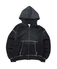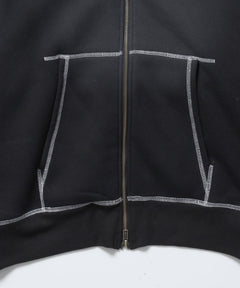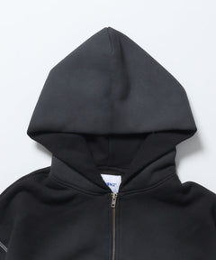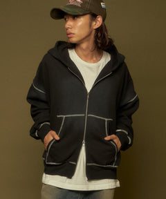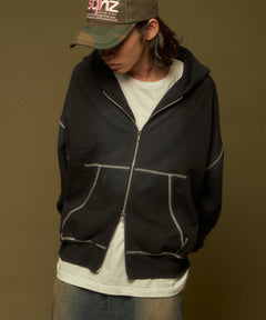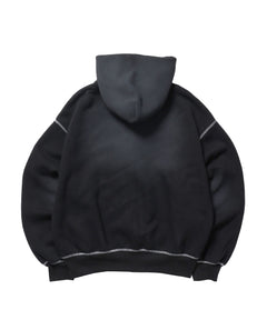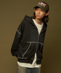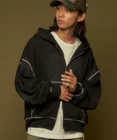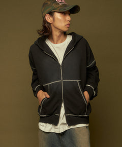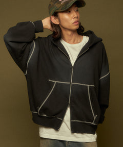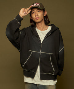 ONI-FADE BOXY ZIP HOODIE / 短丈 フェード オーバーサイズ ヴィンテージライク ステッチ 裏起毛 ブラック ≪SET UP着用可能≫