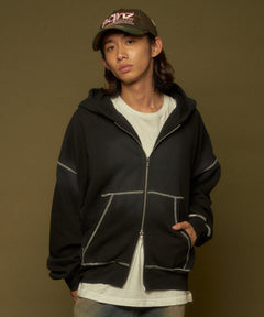 【SEQUENZ(シークエンズ)】ONI-FADE BOXY ZIP HOODIE / 短丈 フェード オーバーサイズ ヴィンテージライク ステッチ 裏起毛