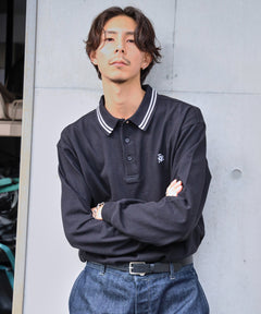 ラインリブロゴ刺繍ポロシャツ / ポロシャツ 鹿の子 Tシャツ 長袖 ワンポイント ブラック