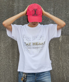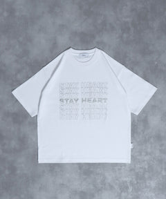 - メッセージロゴショート丈Tシャツ / ぼかしロゴ Tシャツ 短丈 クルーネック 半袖 ホワイト×シルバー