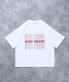 - メッセージロゴショート丈Tシャツ / ぼかしロゴ Tシャツ 短丈 クルーネック 半袖 ホワイト×レッド
