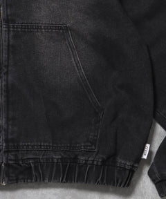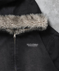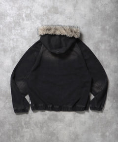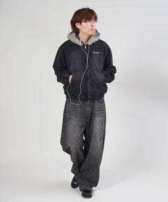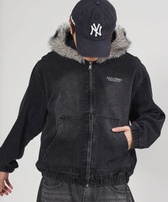 - ヴィンテージライクデニムファージャケット / デニム ジャケット ボア ジップパーカー フーディ 刺繍 加工 ブラック