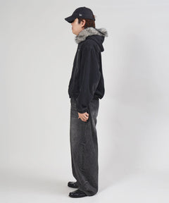 ヴィンテージ感漂うデニム素材とファーの組み合わせが魅力の加工フードジャケット。