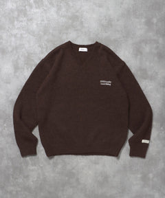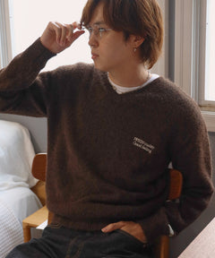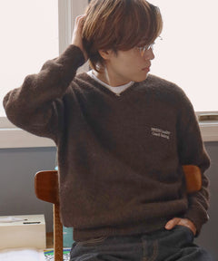 ワンポイントVネックウール混ニット / ウール ニット Vネック 短丈 刺繍 ワンポイント ブラウン