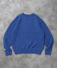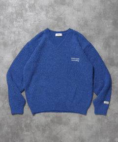 - ワンポイントVネックウール混ニット / ウール ニット Vネック 短丈 刺繍 ワンポイント ブルー