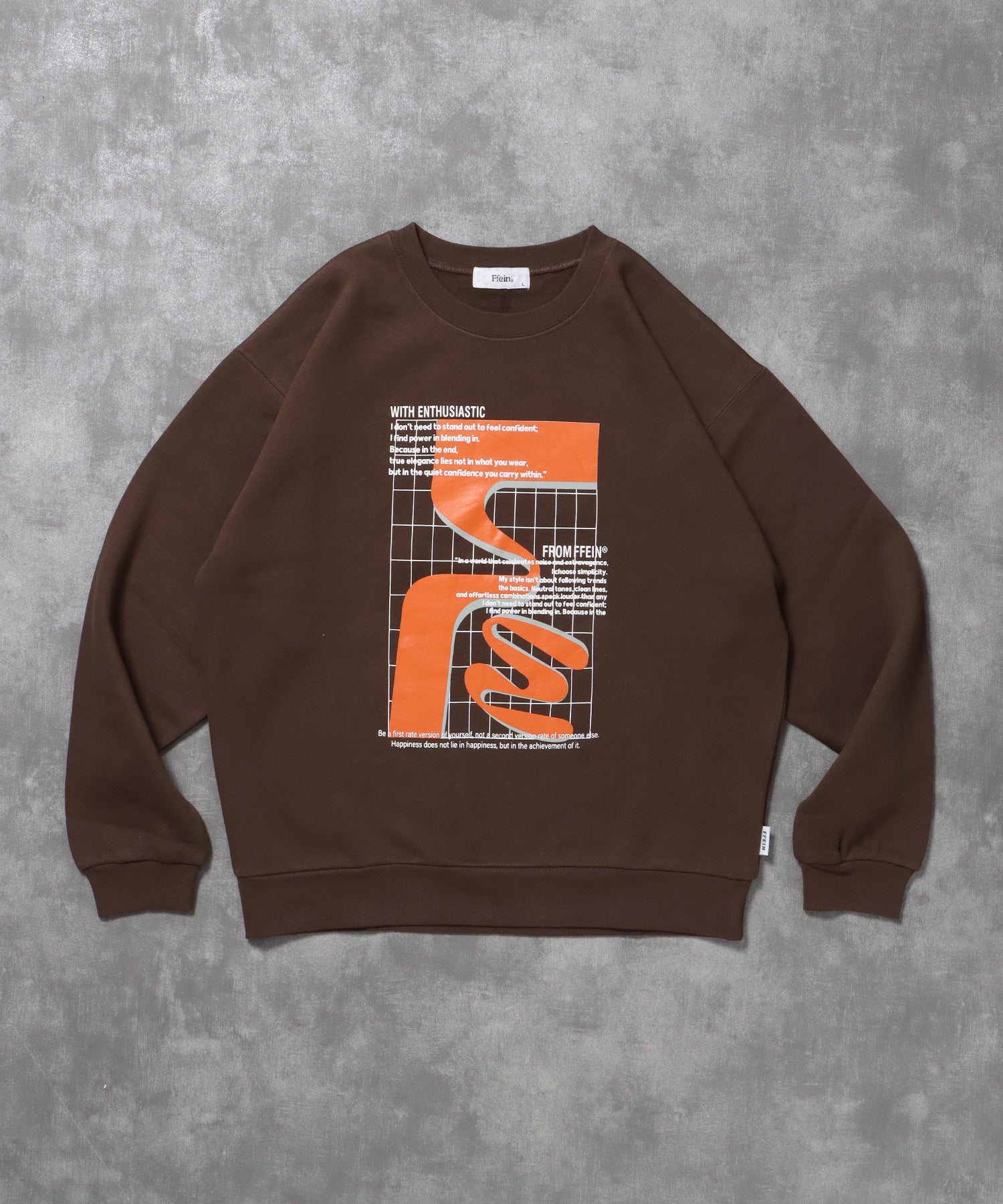 ヘビーウエイト線画アートスウェット / 裏起毛 スウェット アート クルーネック プリント ブラウン