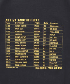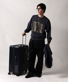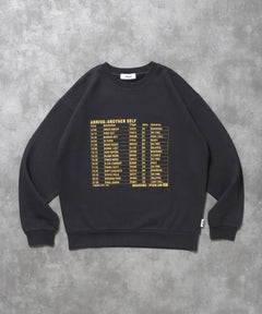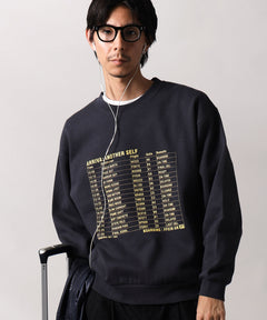 空港の電光掲示板風プリントが目を引く、遊び心あふれるスウェット。