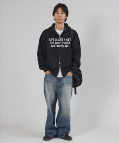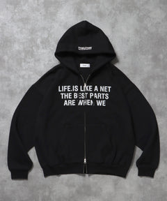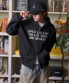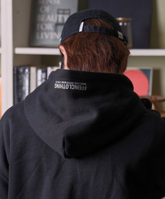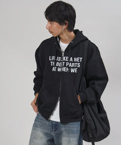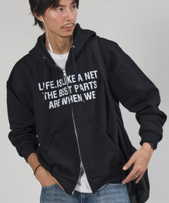 またぎぼかしロゴが特徴的な、トレンド感あふれるジップパーカー。