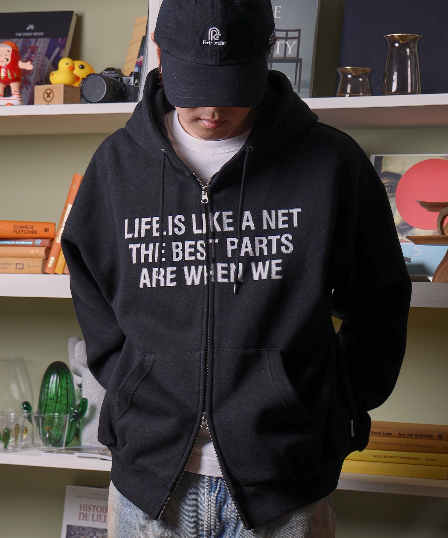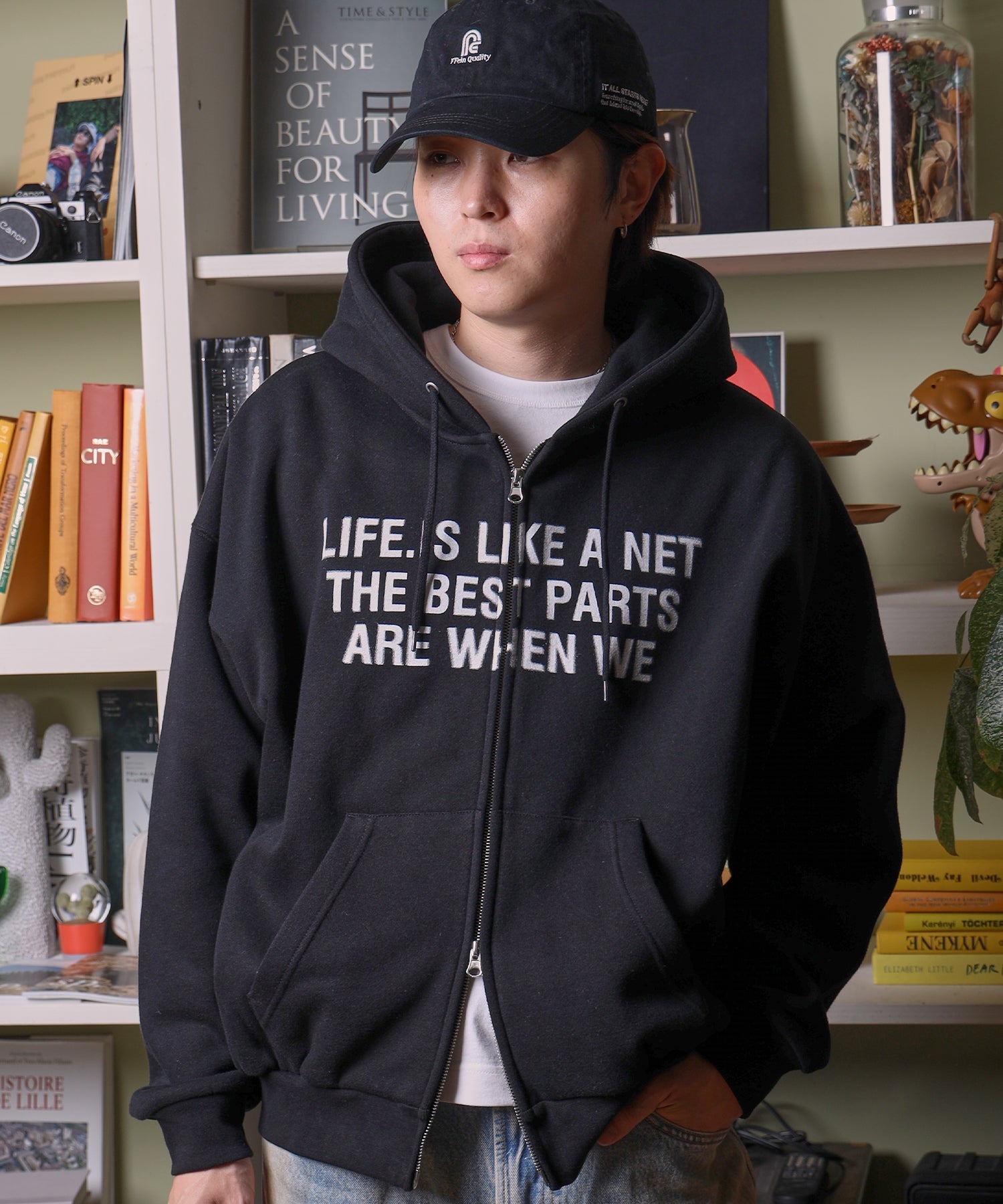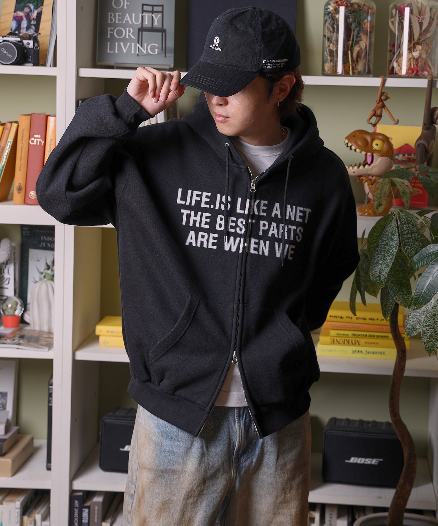 ・スニーカーやキャップをプラスして、ストリート感を演出。