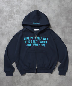 またぎぼかしロゴが特徴的な、トレンド感あふれるジップパーカー。