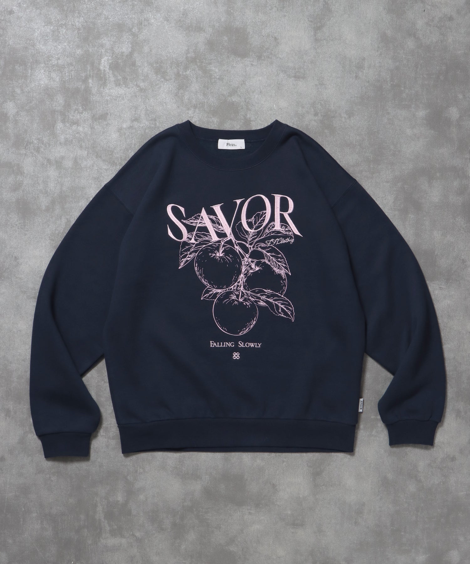 ヴィンテージ感漂うフルーツプリントが魅力の裏起毛スウェット。