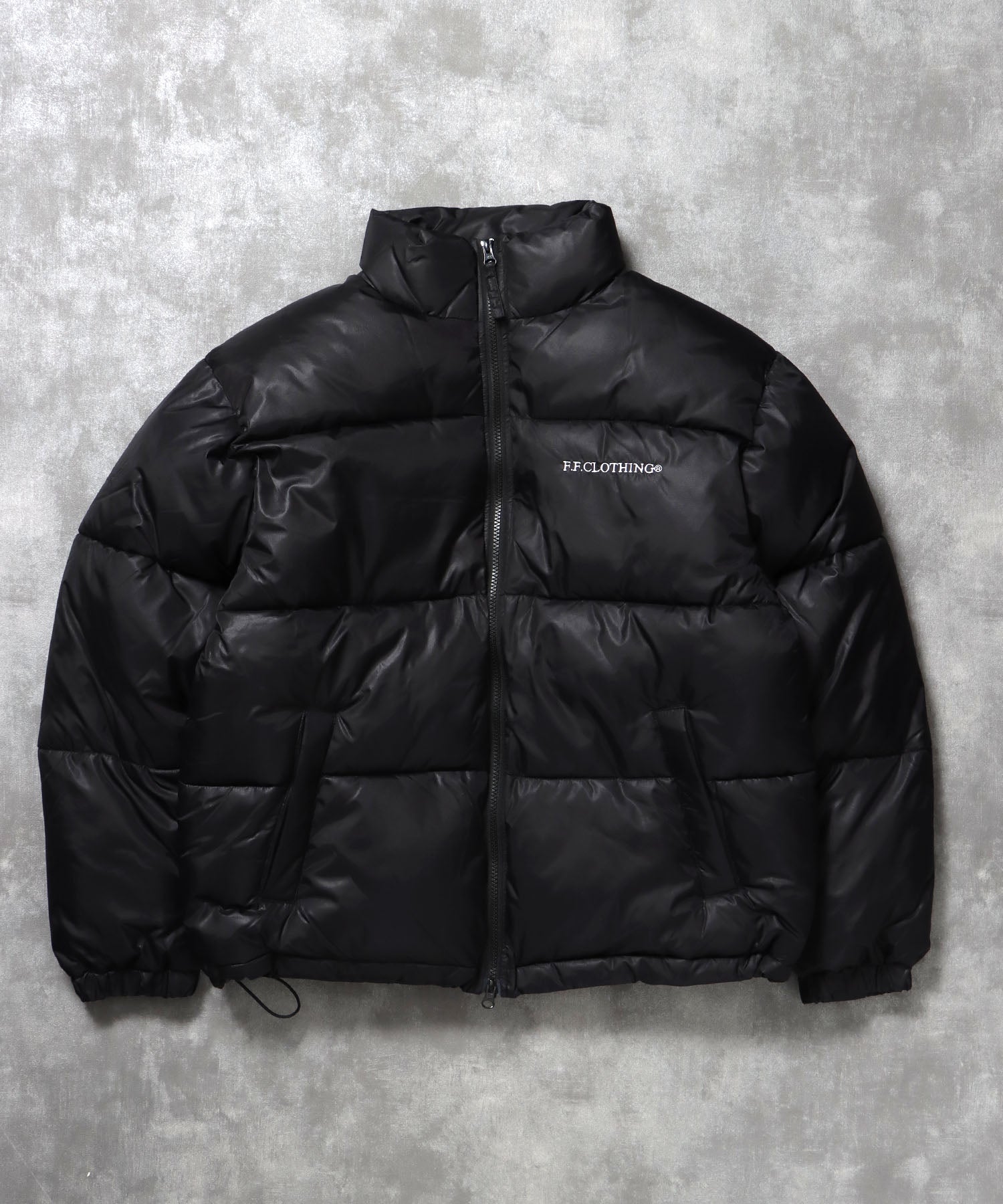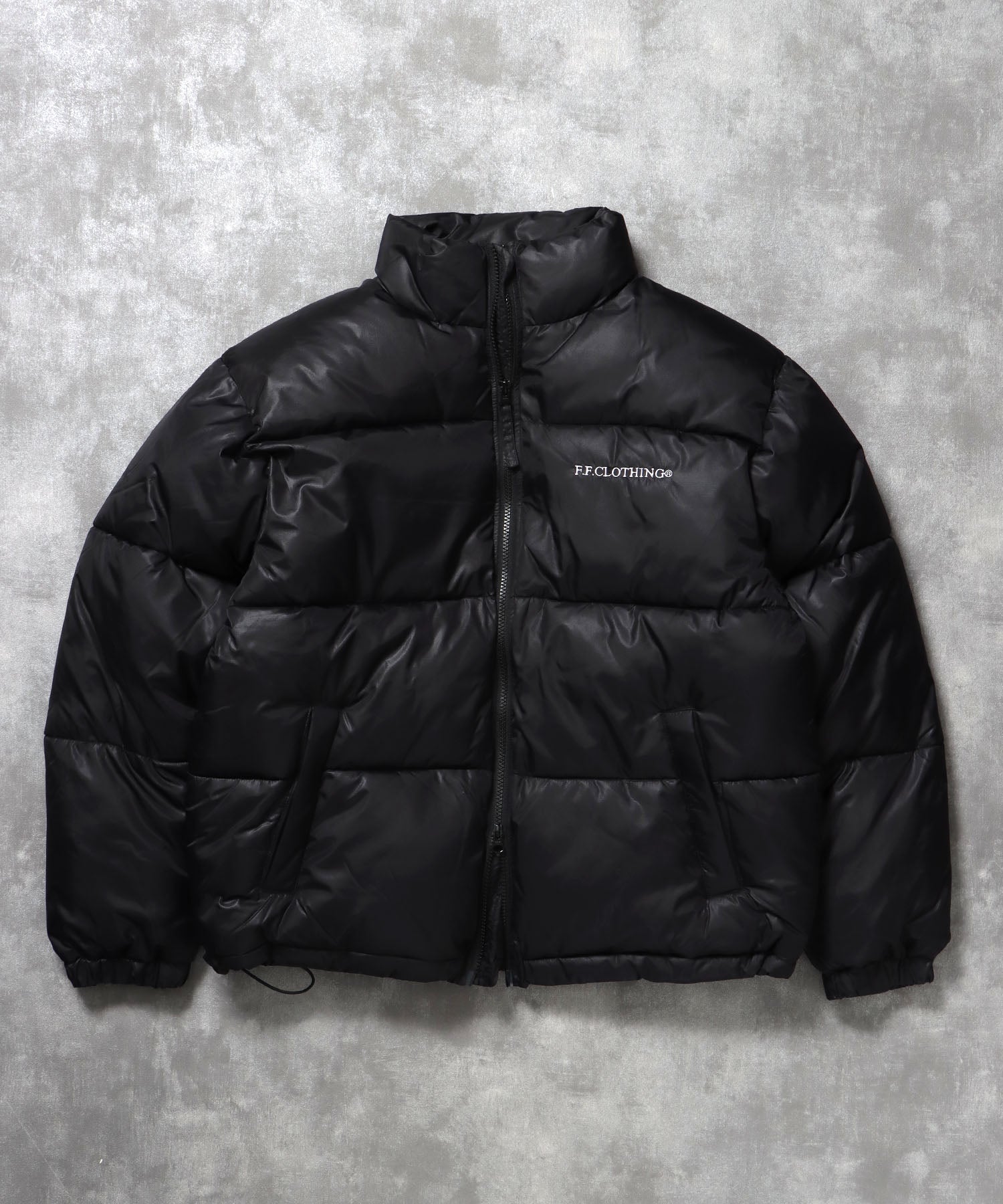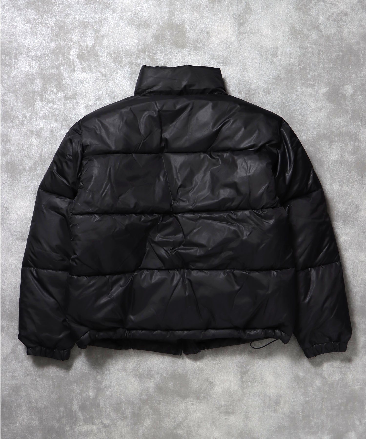 スタンドパファーダウンジャケット / ダウン ジャケット 刺繍 チェック 中綿 ドローコード ブラック