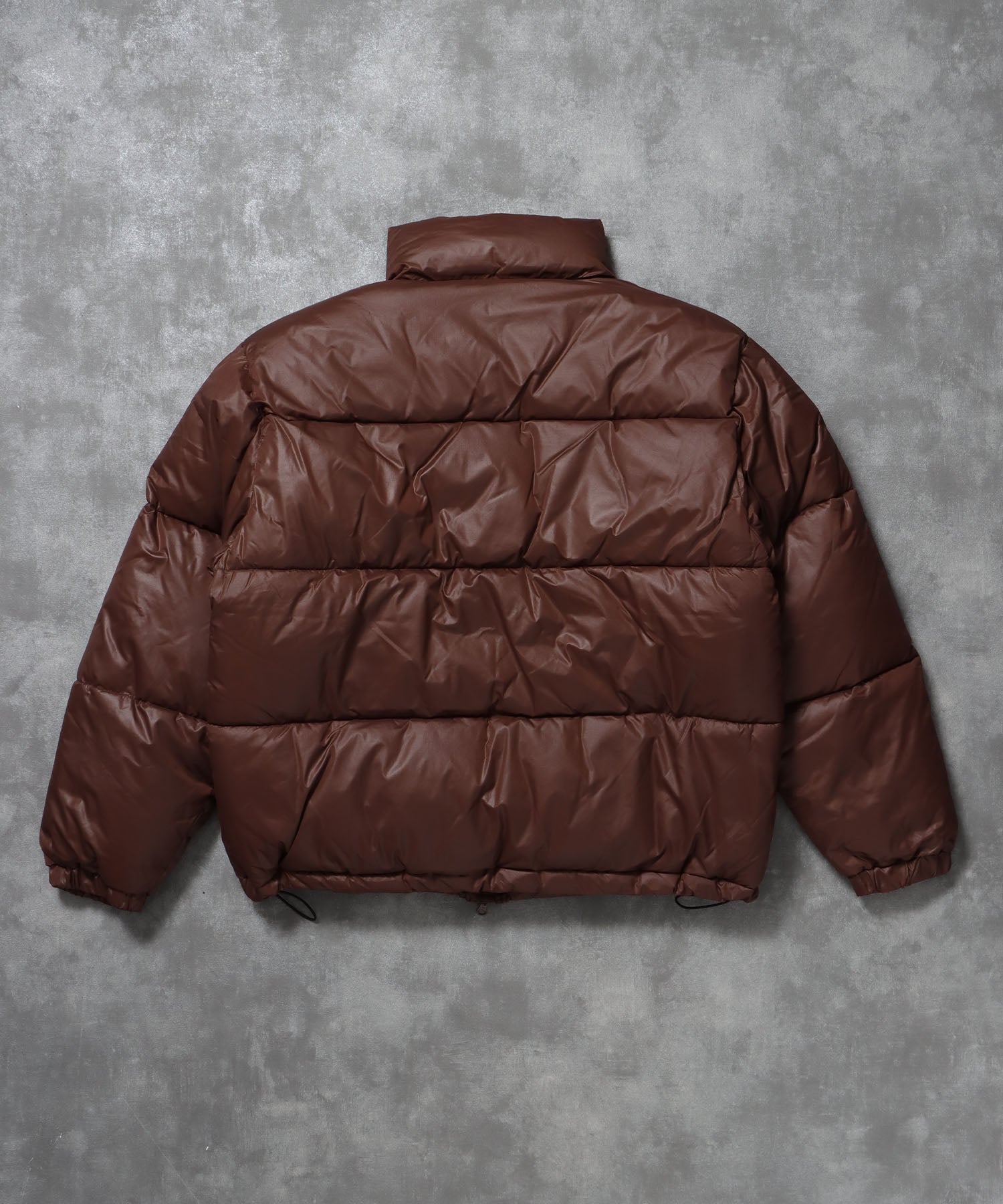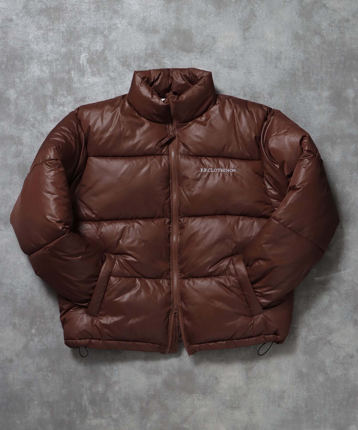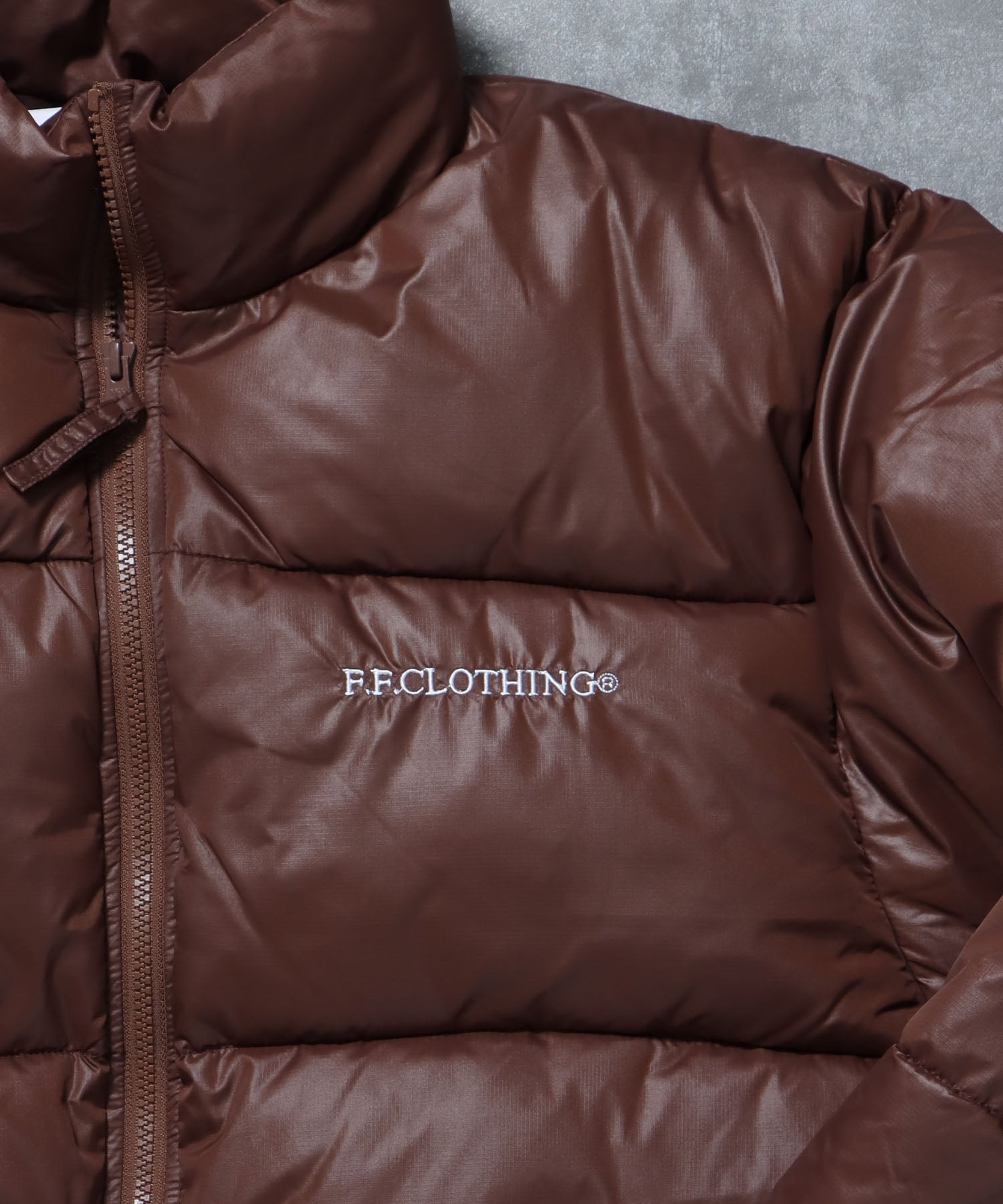 スタンドパファーダウンジャケット / ダウン ジャケット 刺繍 チェック 中綿 ドローコード ブラウン