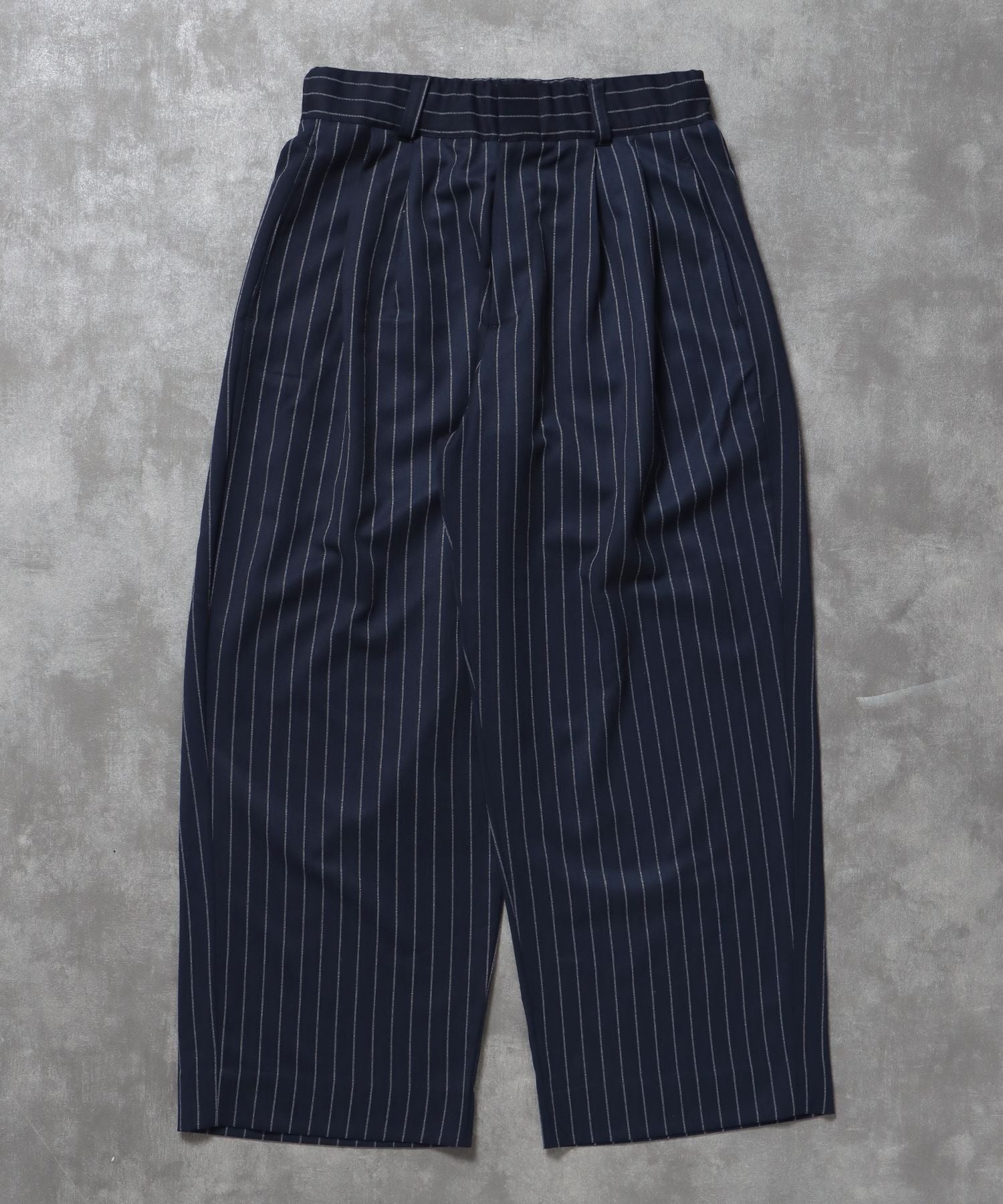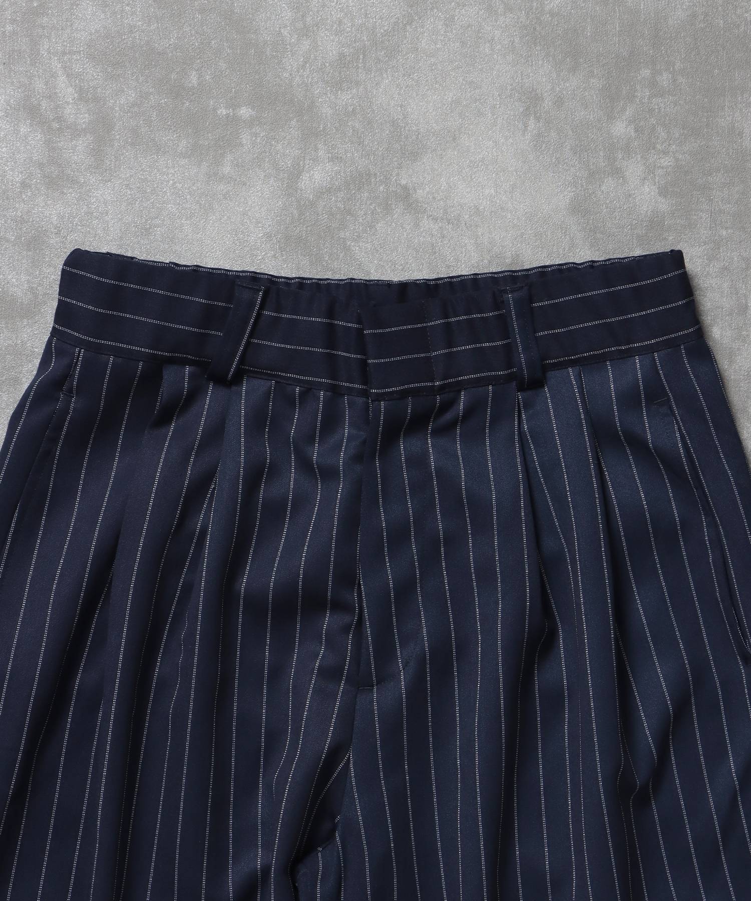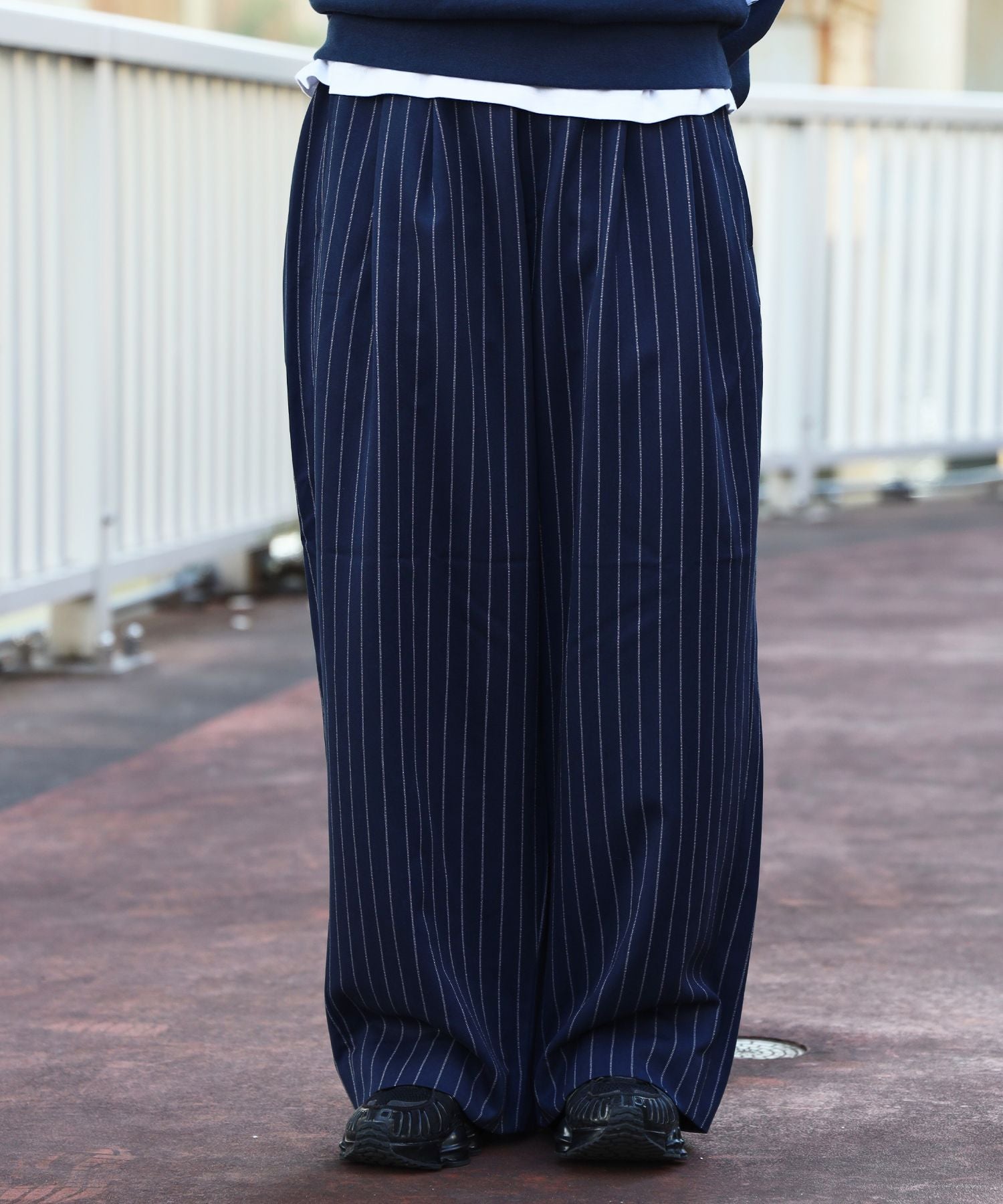 - ストライプワイドタックパンツ / スラックス パンツ ドローストリング ストライプ 起毛 タック ネイビー