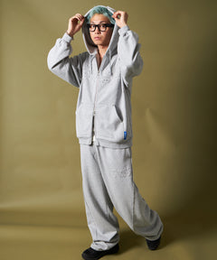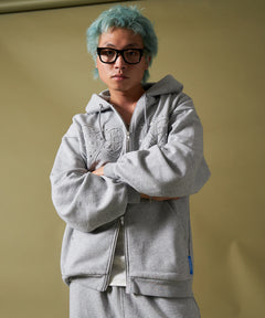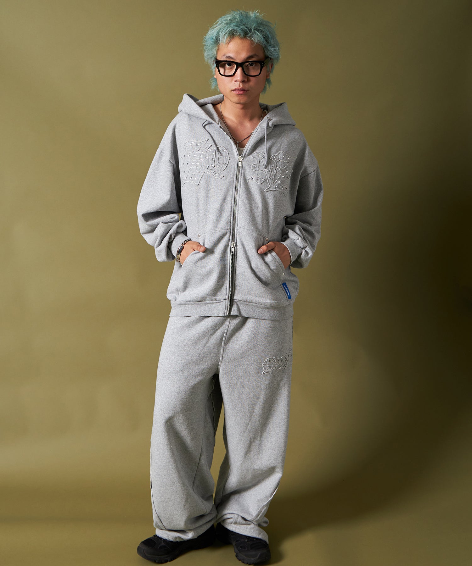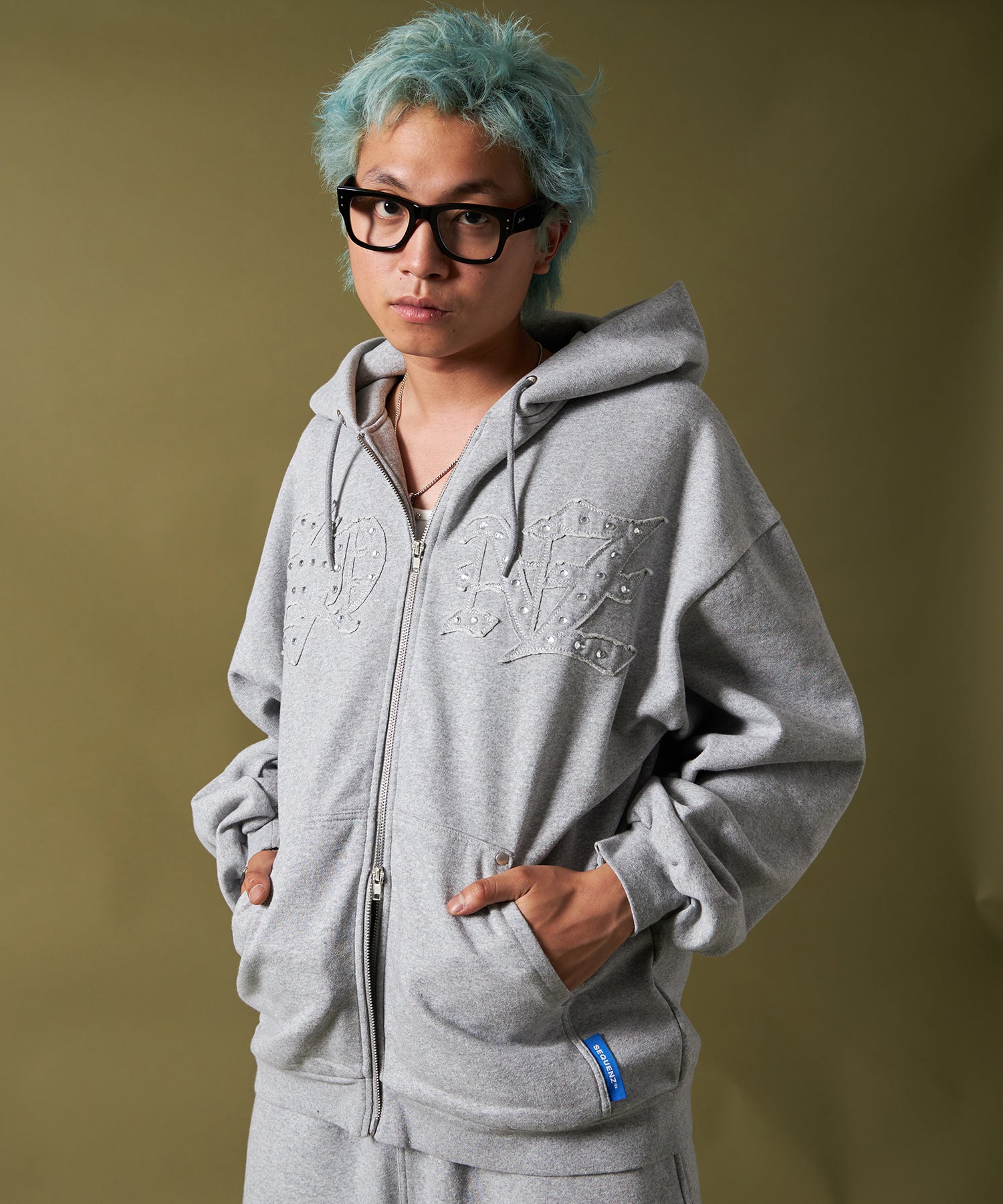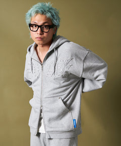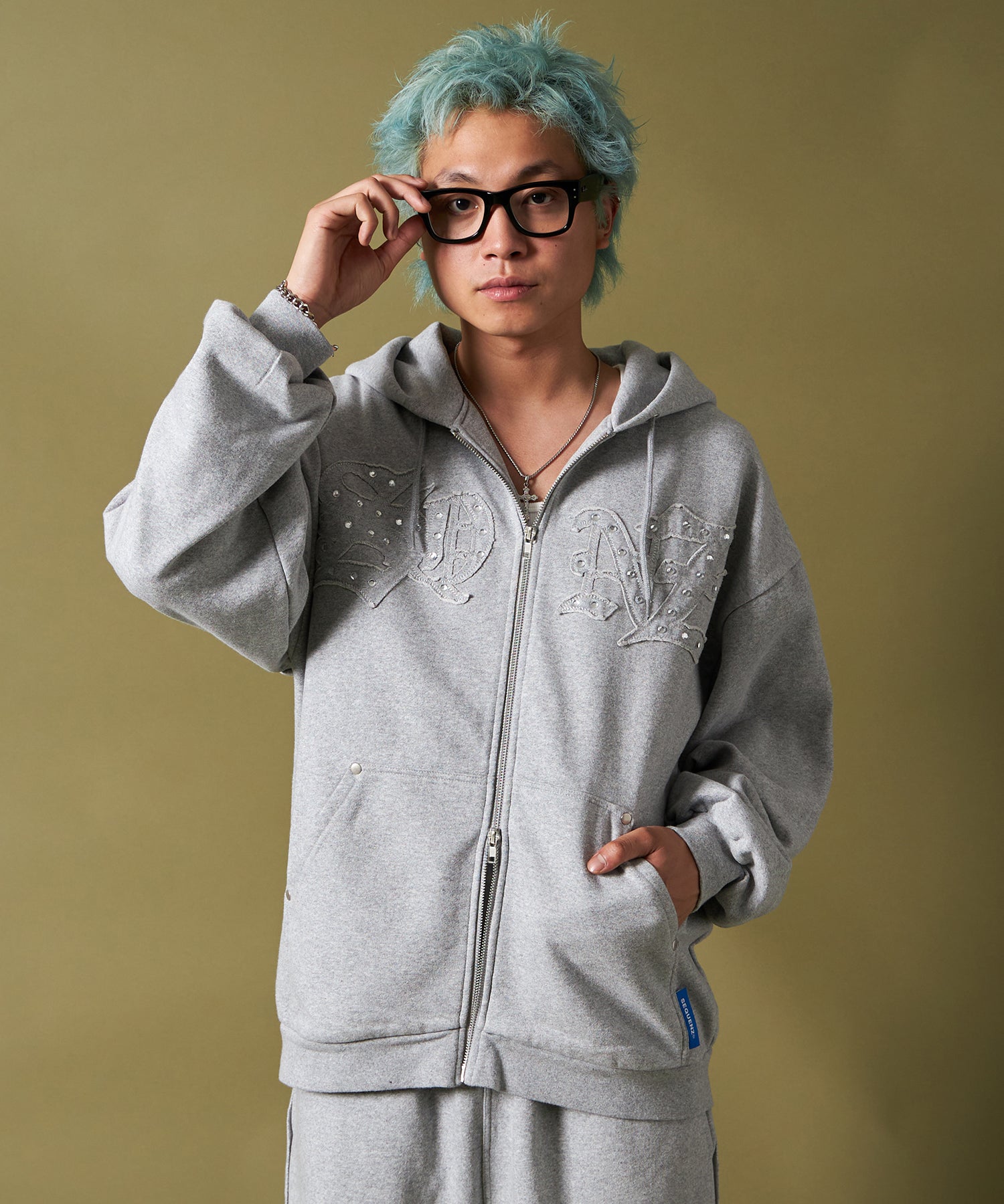 APPLIQUE STONE FADE ZIP P/K / ラインストーン ジップパーカー ダブルジップ 裏起毛 加工 【セットアップ着用可】 グレー