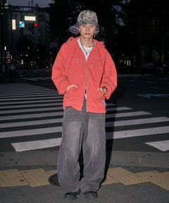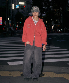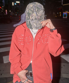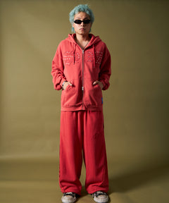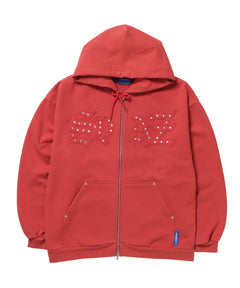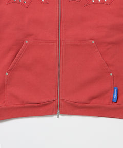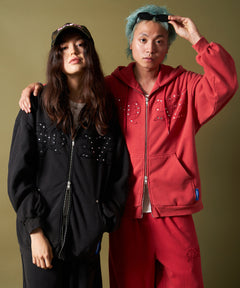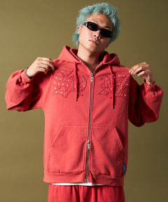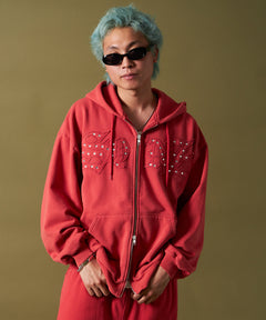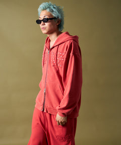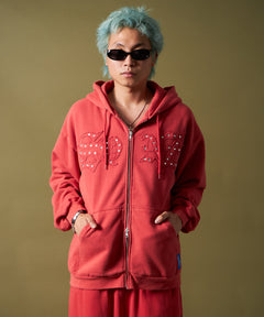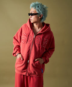 APPLIQUE STONE FADE ZIP P/K / ラインストーン ジップパーカー ダブルジップ 裏起毛 加工 【セットアップ着用可】 レッド