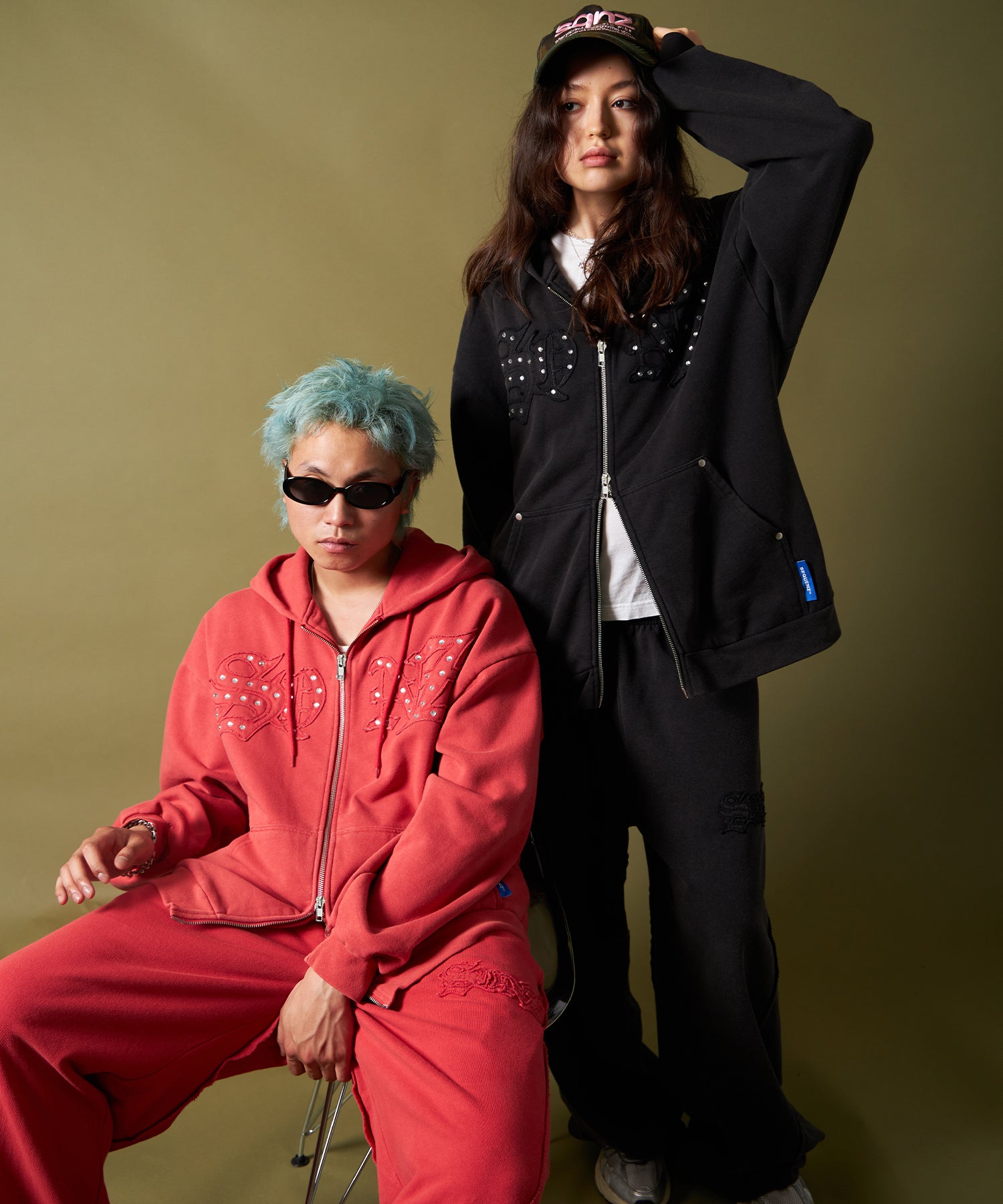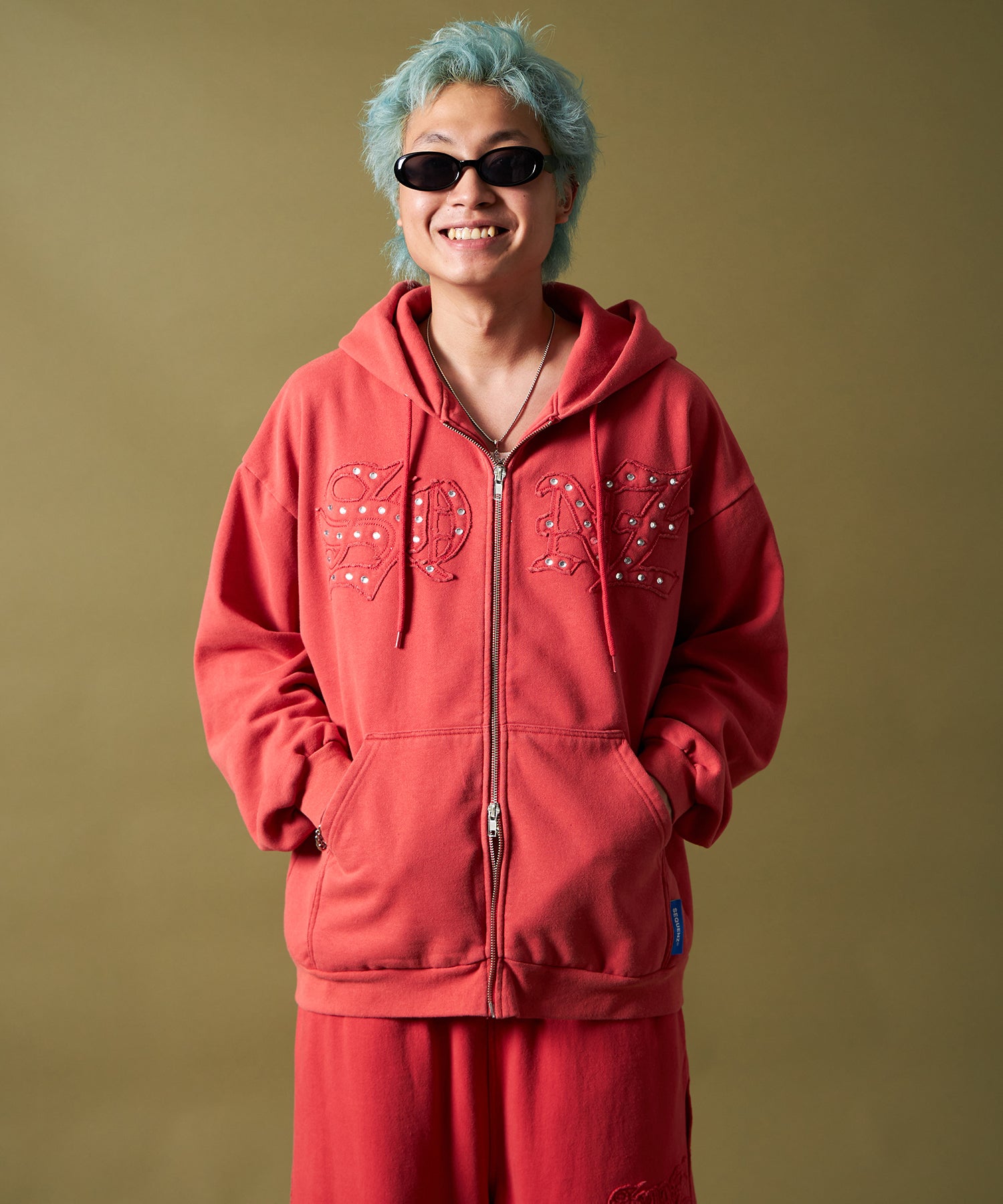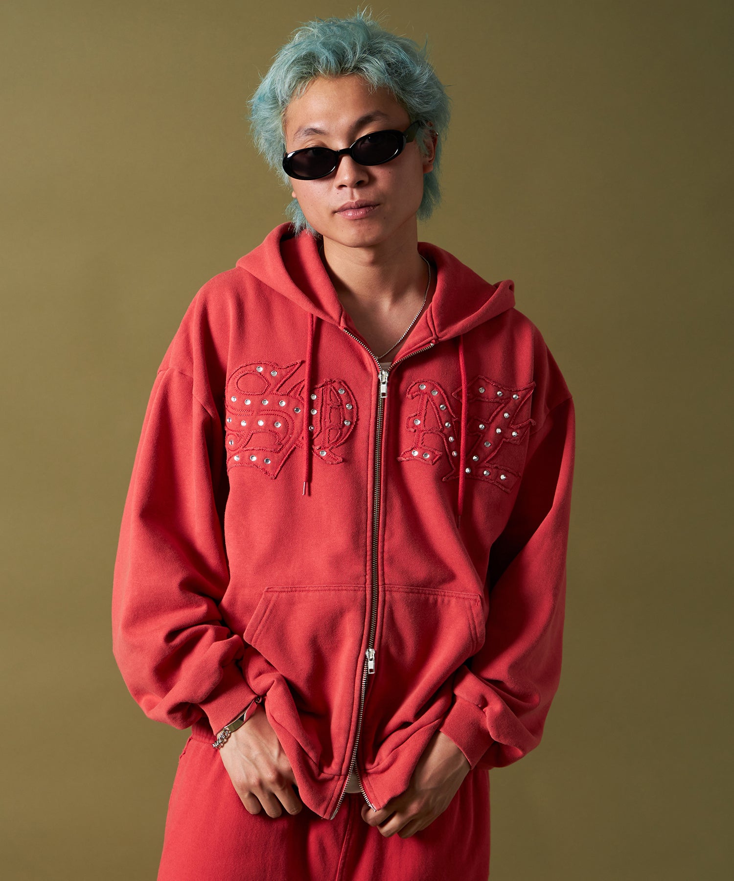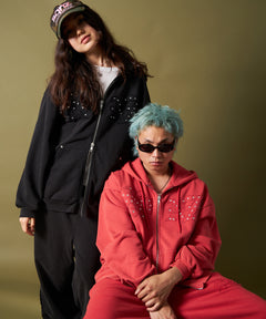 - APPLIQUE STONE FADE ZIP P/K / ラインストーン ジップパーカー ダブルジップ 裏起毛 加工 【セットアップ着用可】 レッド