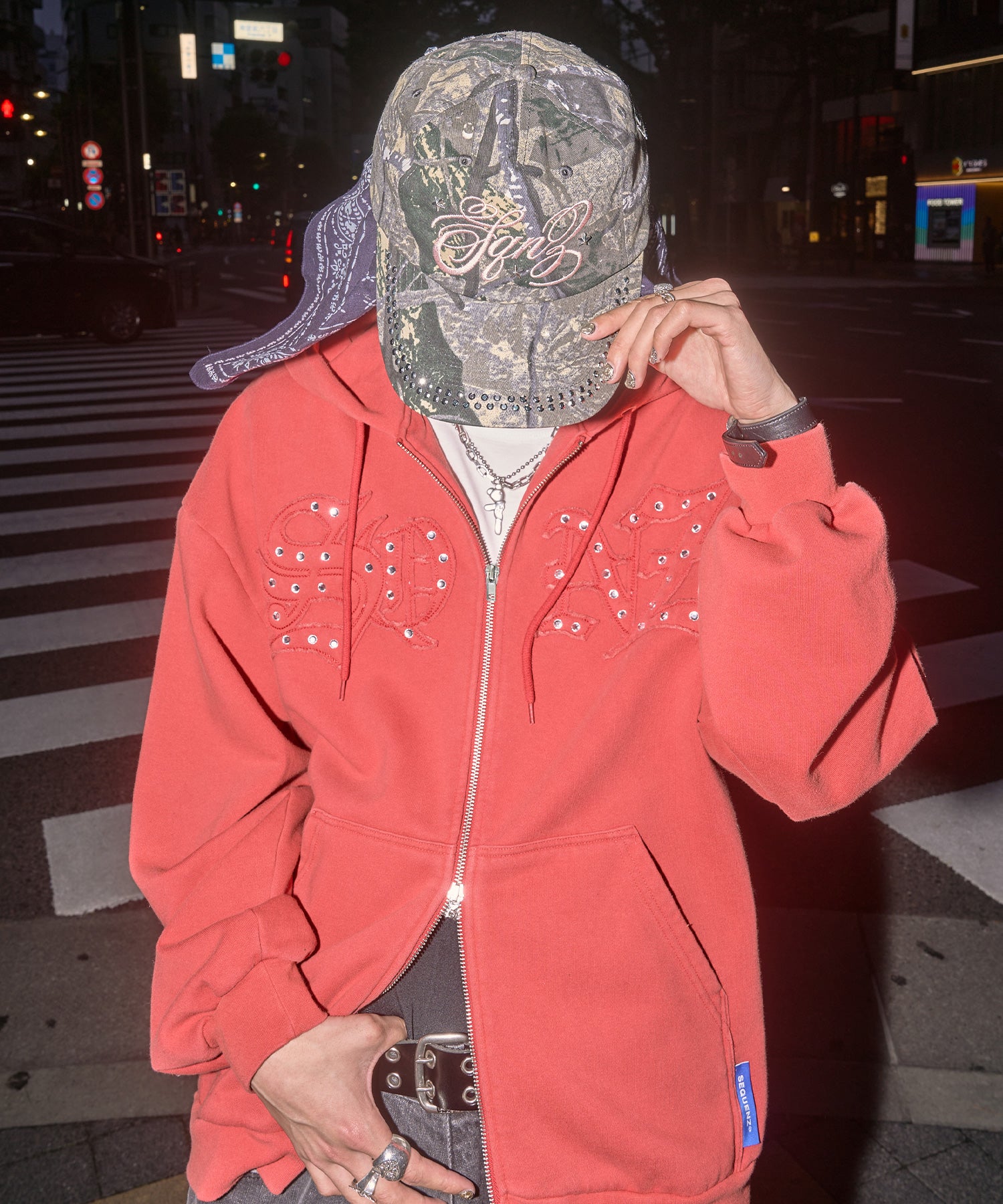 トレンド感たっぷりのワッペンデザインとラインストーンが光る、存在感抜群のジップパーカー。
