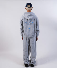 ラインストーン×クロス柄が目を引く、キラリと光るディテールがアクセントのセットアップジップパーカー。
