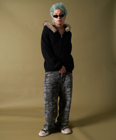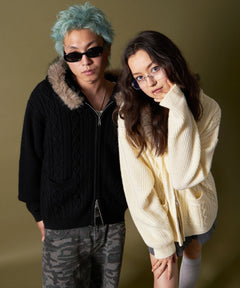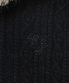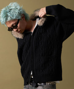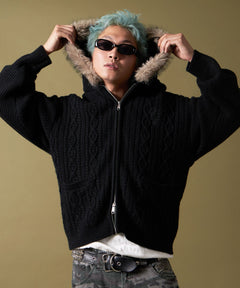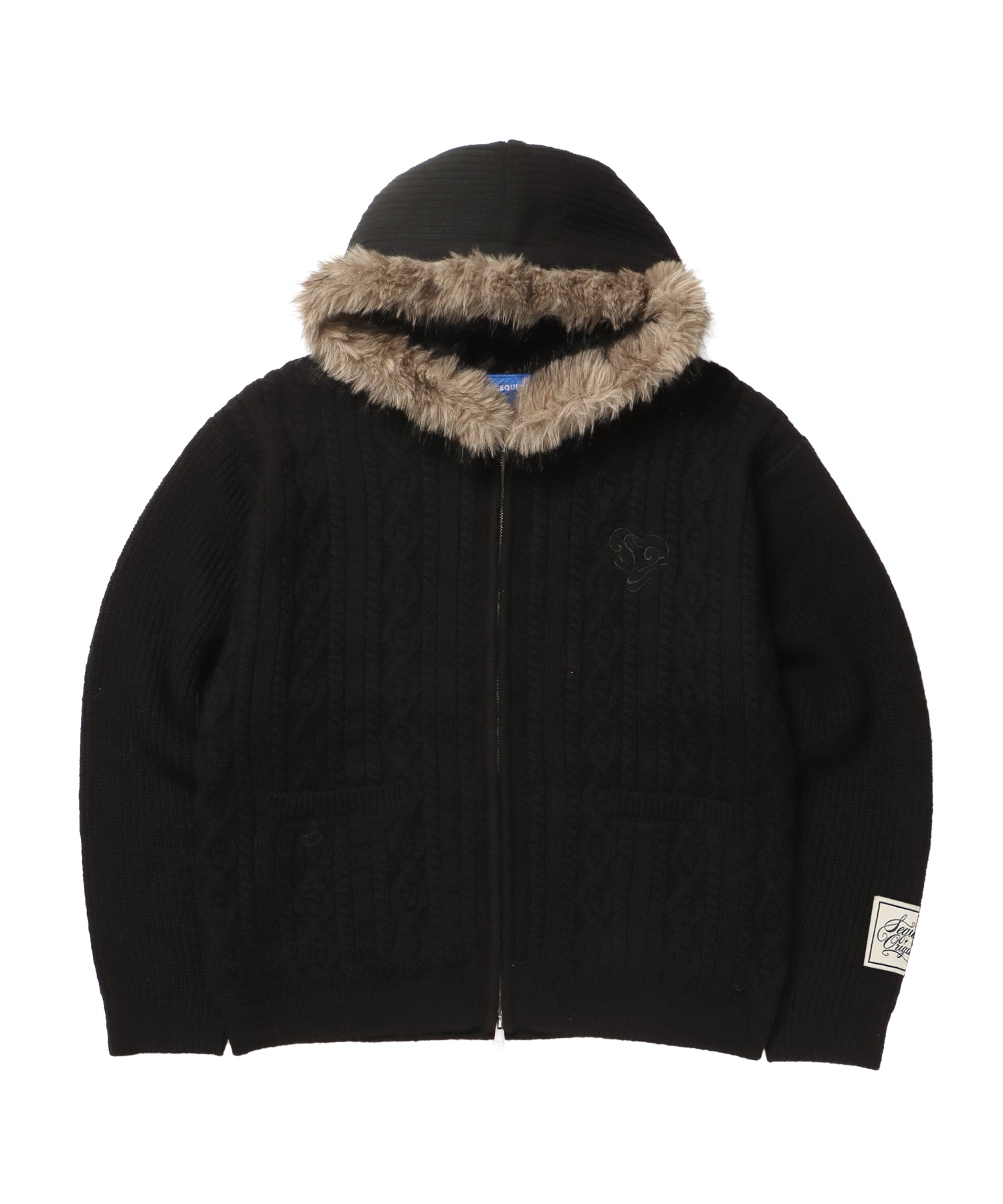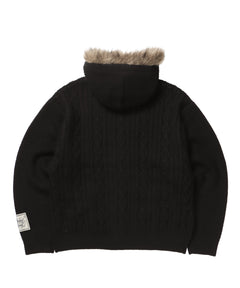 FUR CABLE KNIT ZIP-UP HOODIE / ニット ジップパーカー 刺繍 ファー ケーブルニット ブラック