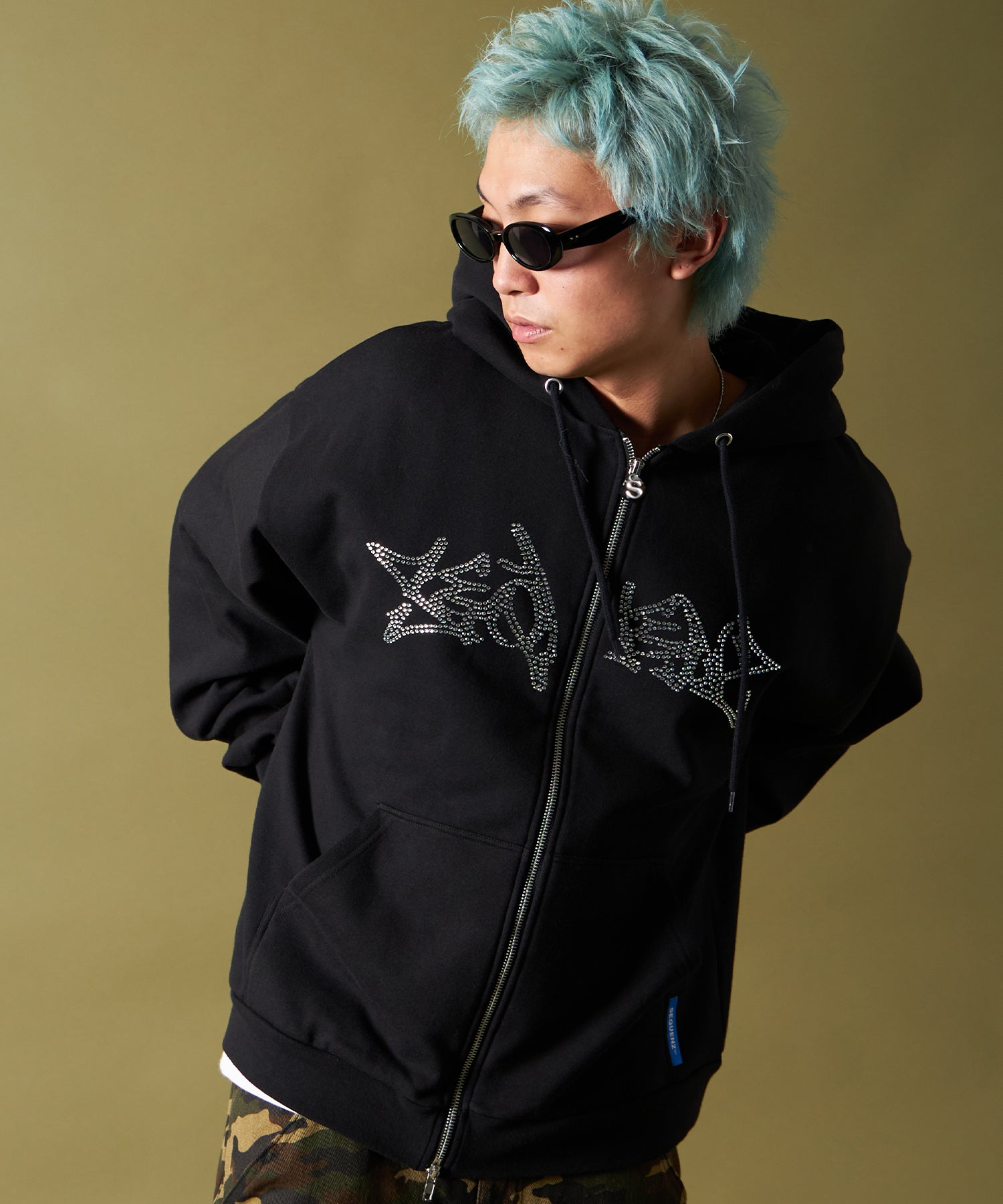 - RHINE STONE ZIP P/K / ラインストーン ジップパーカー 裏起毛 フーディ スウェット ブラック