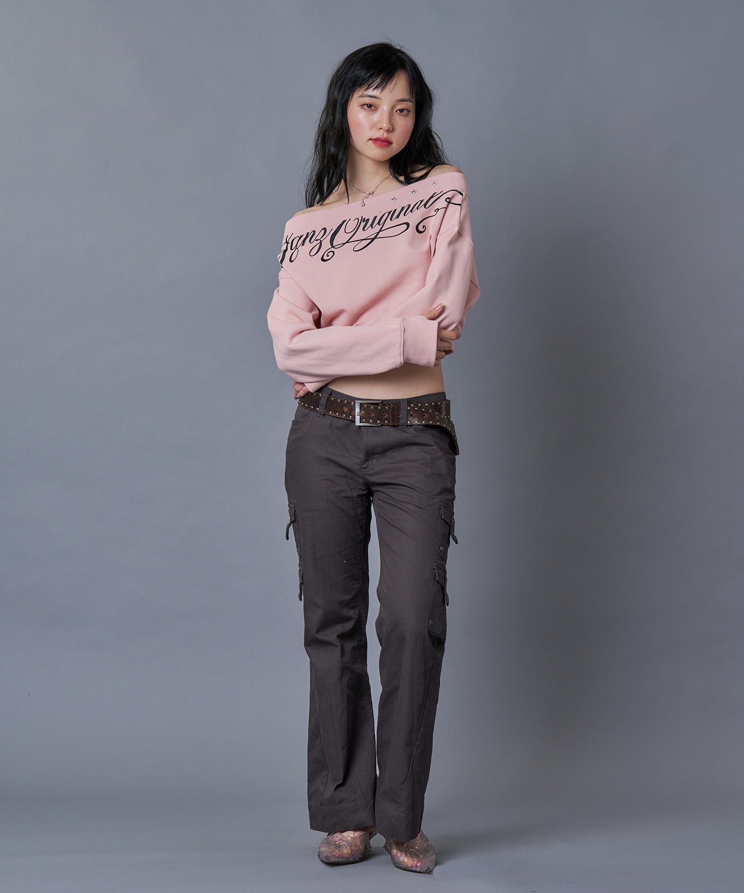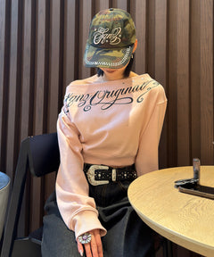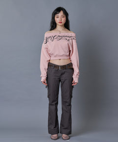 ・オフショルダーのような肩落ちデザインとへそ出しが女性らしい抜け感、Y2Kな雰囲気を演出。