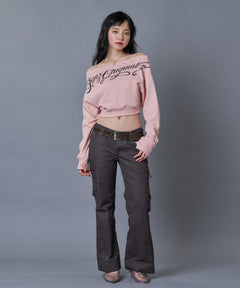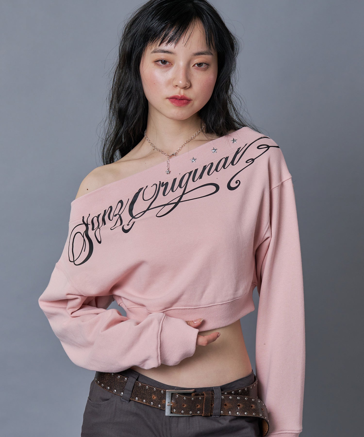 sqnz star shoulder sweat ladies / レディース ワンショルダー スタッズ 裏毛 短丈 サムホール ピンク