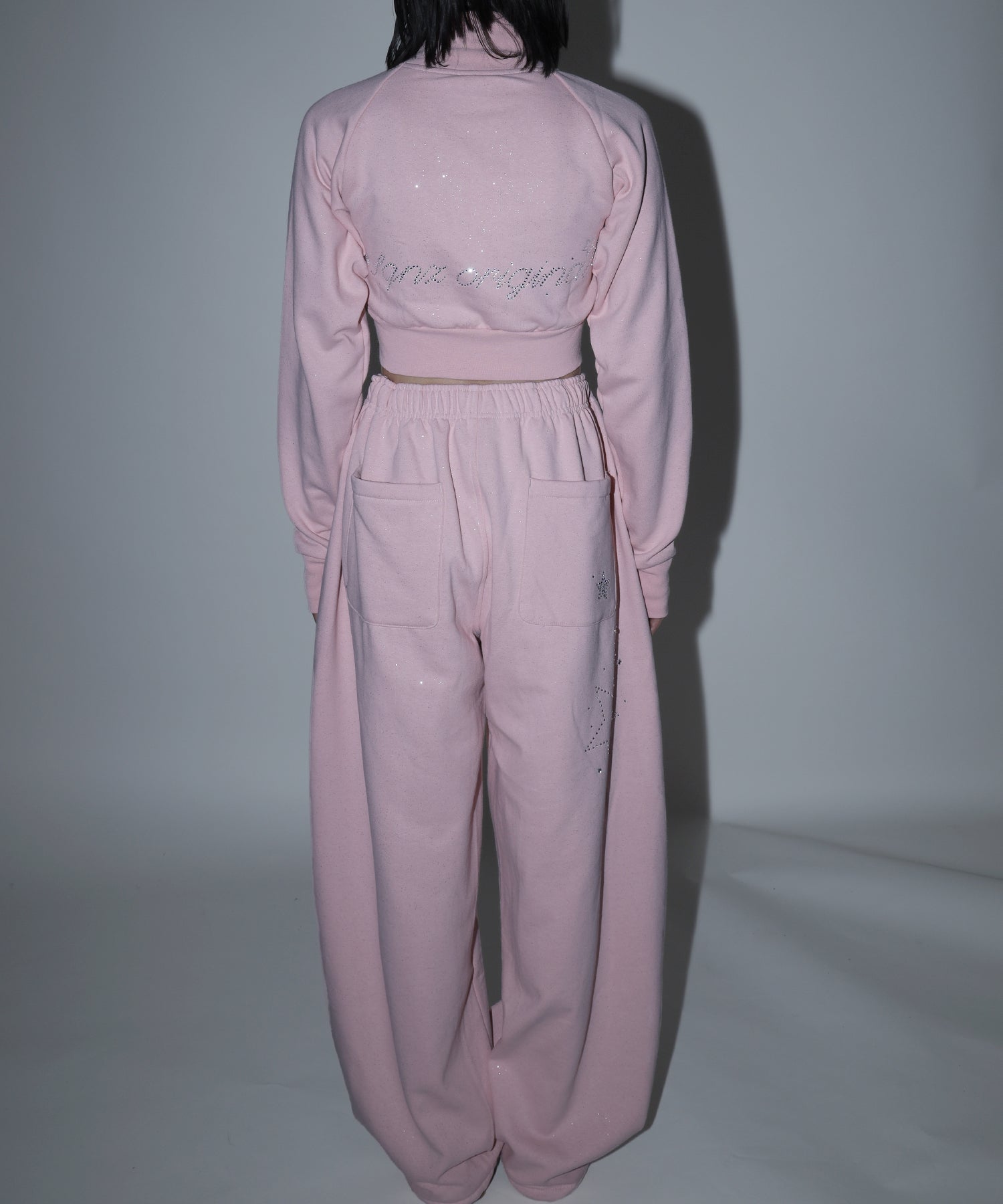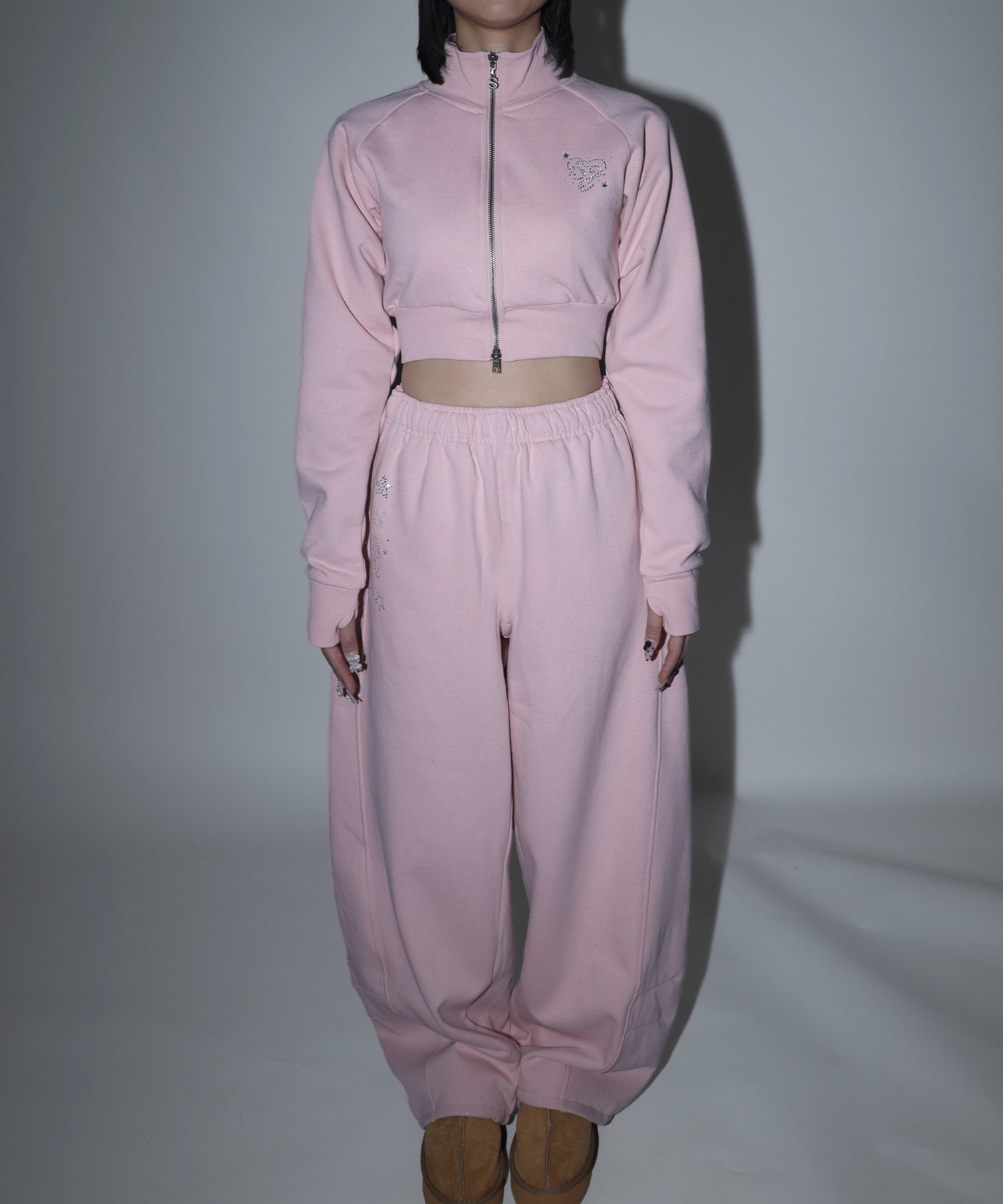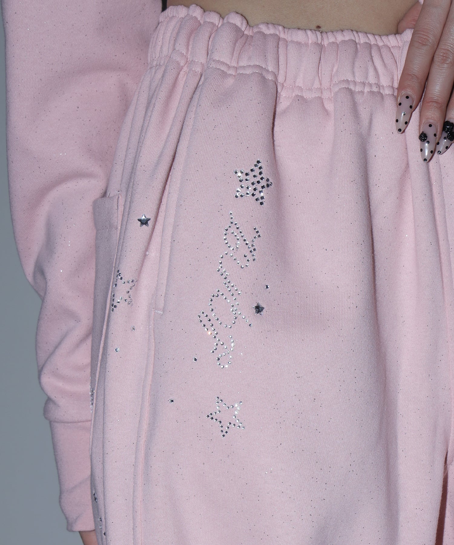 - sqnz glitter sweat pants / グリッター スウェットパンツ ラインストーン ドローストリング ポケット 裏起毛 【セットアップ着用可能】 ペールピンク