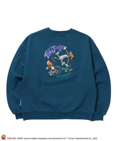 トムとジェリーがスケートボードで追いかけっこ!遊び心満載の刺繍デザインスウェット。