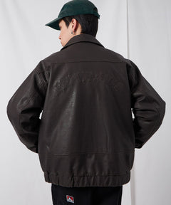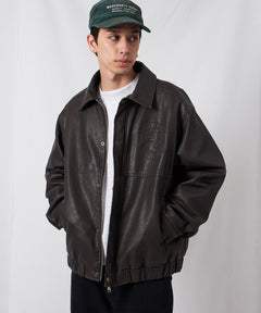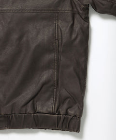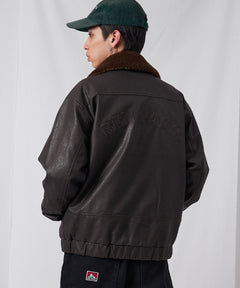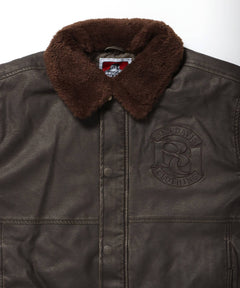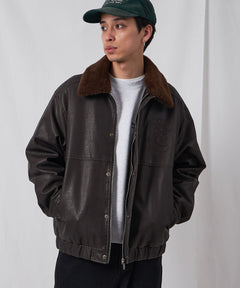 REMOVAL BOA COLLAR FAUX LEATHER JACKET / フェイクレザー ジャケット ボア ジップ キルティング ワッペン ブラウン