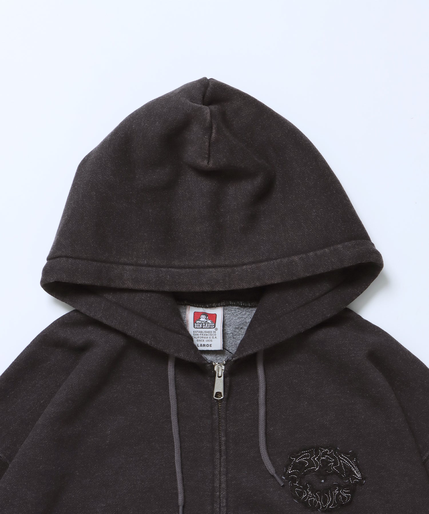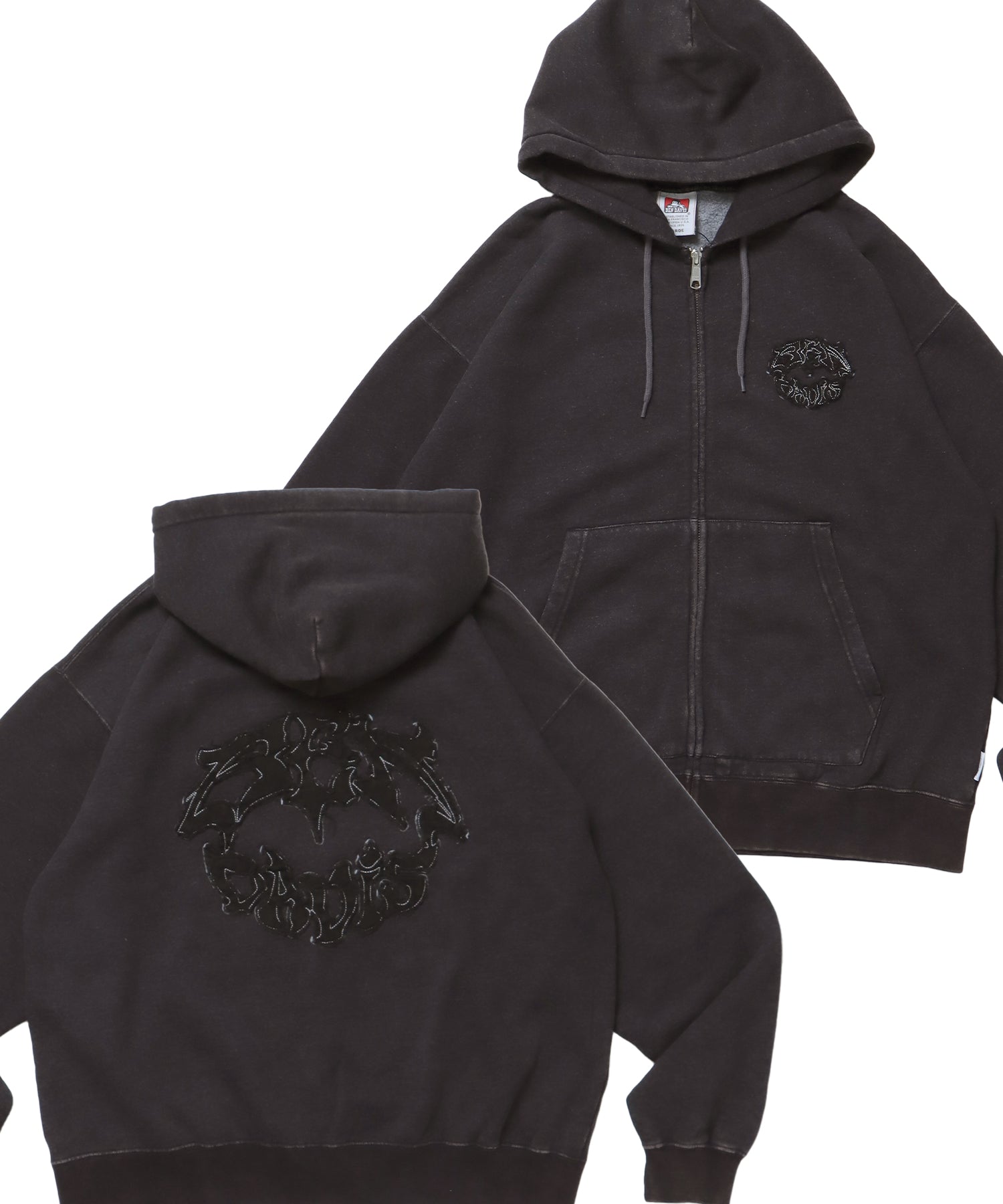 PATCHING BLEACH ZIP HOODIE / 加工 ジップパーカー ワッペン フーディ 裏起毛 ブラック