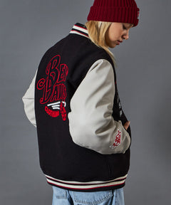 ベンデイビスから身頃フェイクメルトン、袖フェイクレザーを使用したスタジアムジャケットが登場! 前後身頃、両袖に刺繍ワッペンを豪華に施したデザインが◎ 背面の柄は太番の糸を使用したチェーン刺繍で表現された雰囲気抜群な細密まで拘った1着!