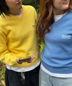 - ワンポイントロゴVネックニット/ ニット Vネック 刺繍 ワンポイント 長袖 【短丈】 イエロー