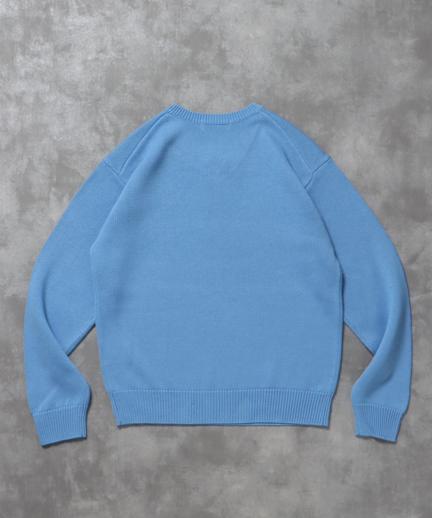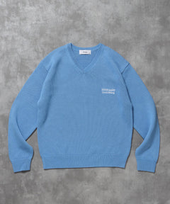 ワンポイントロゴVネックニット/ ニット Vネック 刺繍 ワンポイント 長袖 【短丈】 ブルー