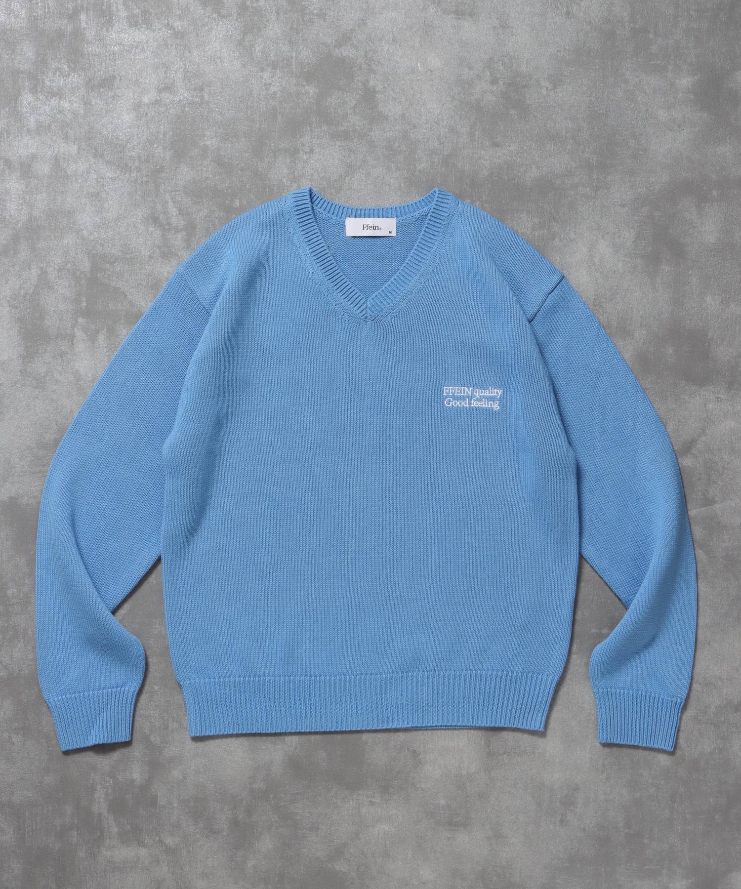 - ワンポイントロゴVネックニット/ ニット Vネック 刺繍 ワンポイント 長袖 【短丈】 ブルー