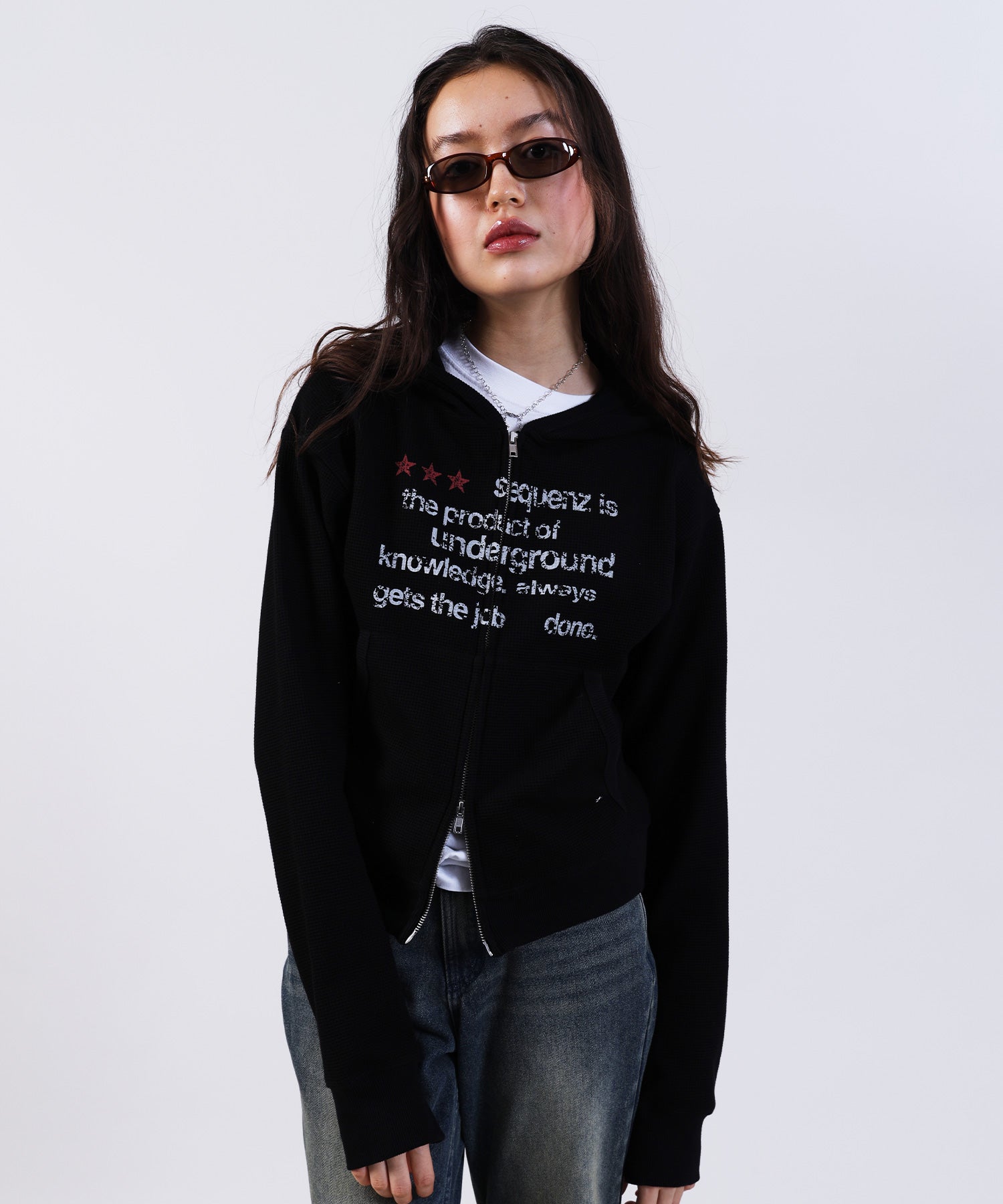 - THERMAL LADIES ZIP UP LADIES / ワッフル レディース ジップパーカー サーマル ダブルジップ フーディ ブラック