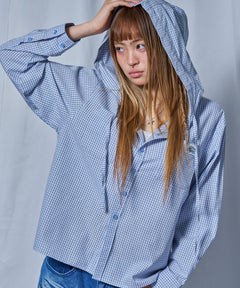 ・チェック柄にフード付きの個性派シャツデザインで、印象的なストリートスタイルに。