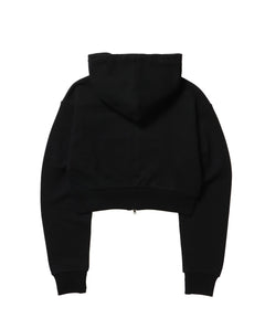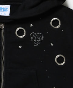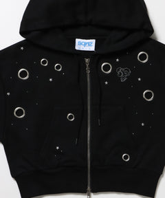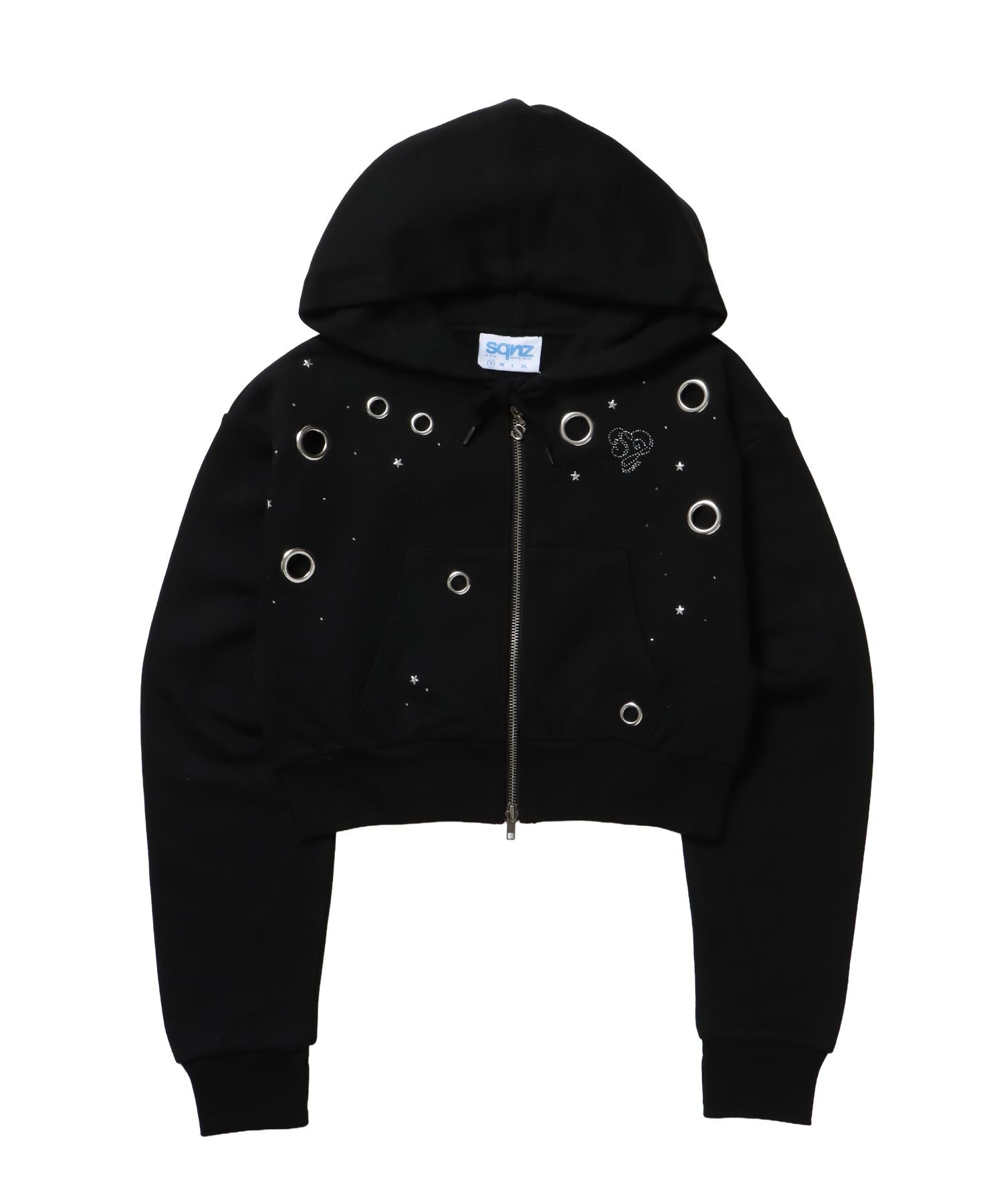 - sqnz rhinestone & eyelet zip p/k / ジップパーカー スタッズ ハトメ ラインストーン フーディ 短丈 裏毛 【セットアップ着用可能】 ブラック