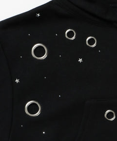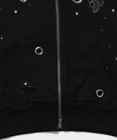 sqnz rhinestone & eyelet zip p/k / ジップパーカー スタッズ ハトメ ラインストーン フーディ 短丈 裏毛 【セットアップ着用可能】 ブラック
