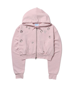 sqnz rhinestone & eyelet zip p/k / ジップパーカー スタッズ ハトメ ラインストーン フーディ 短丈 裏毛 【セットアップ着用可能】 ライトピンク