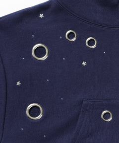 ・カジュアルながら華やかさをプラスする、フロント全面のハトメ、スタッズ、ラインストーンデザイン。