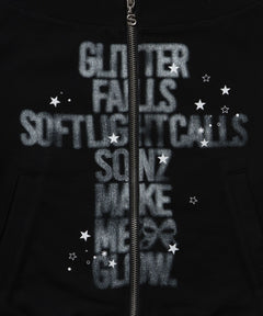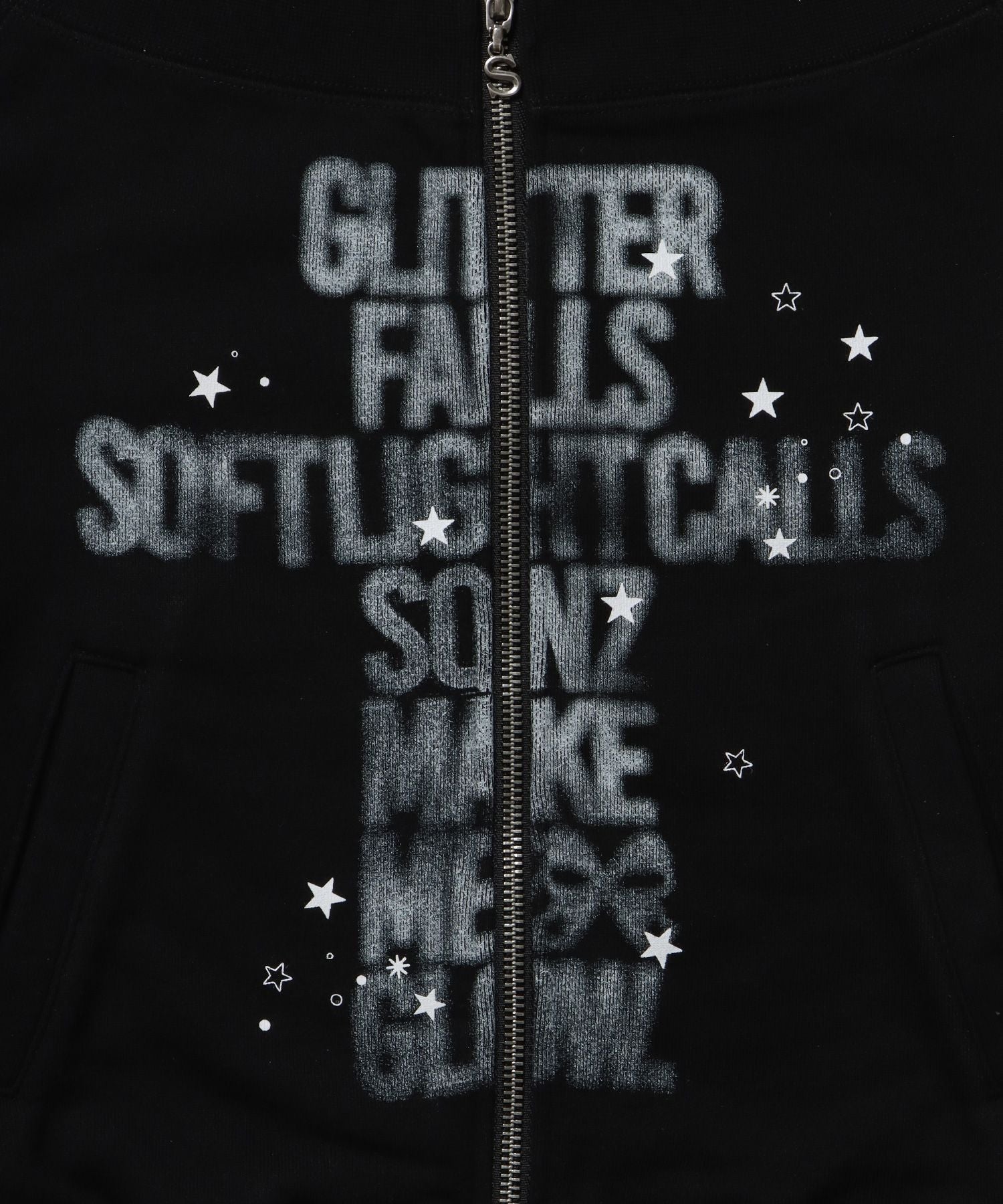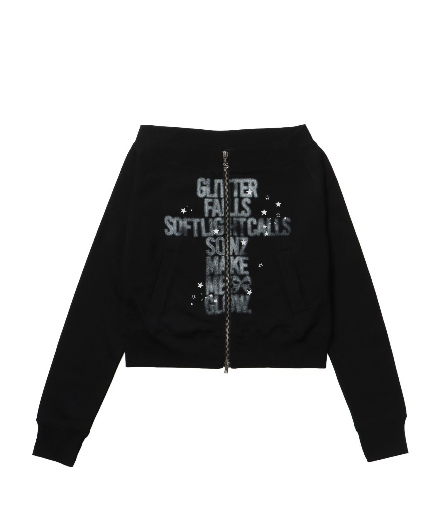 - sqnz off shoulder zip p/k / オフショルダー ダブルジップ スウェット 裏毛 ワンポイント サムホール プリント ブラック
