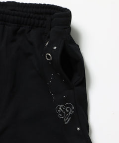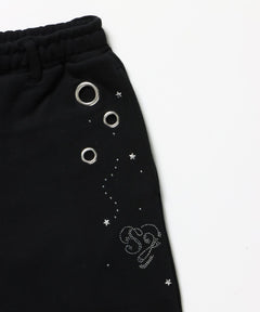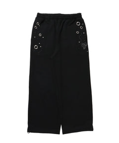 独特なデザインが魅力のラインストーン&ハトメ装飾。柔らかい裏毛で快適さも抜群のスウェットパンツ。